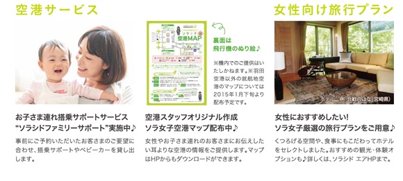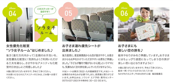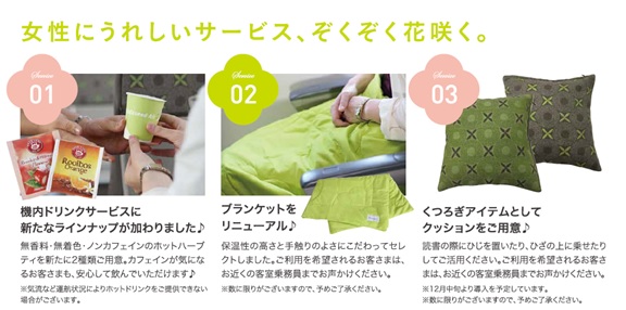 ソラシド エアの機内で女性向けのホットハーブや、ブランケットのリニューアル、クッション(12月中旬より導入)、女性優先化粧室や女性向け旅行プランなど、ソラ女子プロジェクトが考案したサービスを11月1日からスタートさせる。