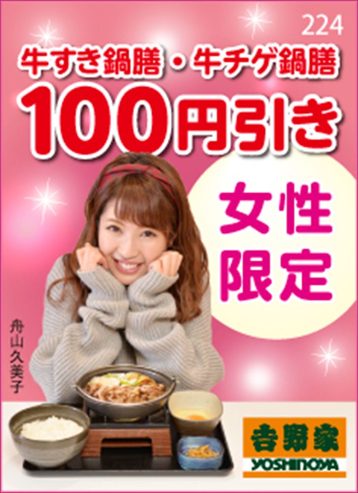 また、今回のレポートに因み、オリジナルクーポンが発行される。「これからは女性の方にも、もっと気軽に吉野家さんに行ってもらいたいと思い、吉野家さんにお願いして、私がデザインされた女性限定のオリジナルモバイルクーポンをつくってもらいました。 1月7日(水)から21日(水)まで「牛すき鍋膳」「牛チゲ鍋膳」が100円引きで何回でも利用できます。お得なクーポンを利用して、寒い季節にぴったりの「牛すき鍋膳」で一人でも多くの女性の皆さんに吉野家デビューしてほしいと思います!」としっかりとPRした。