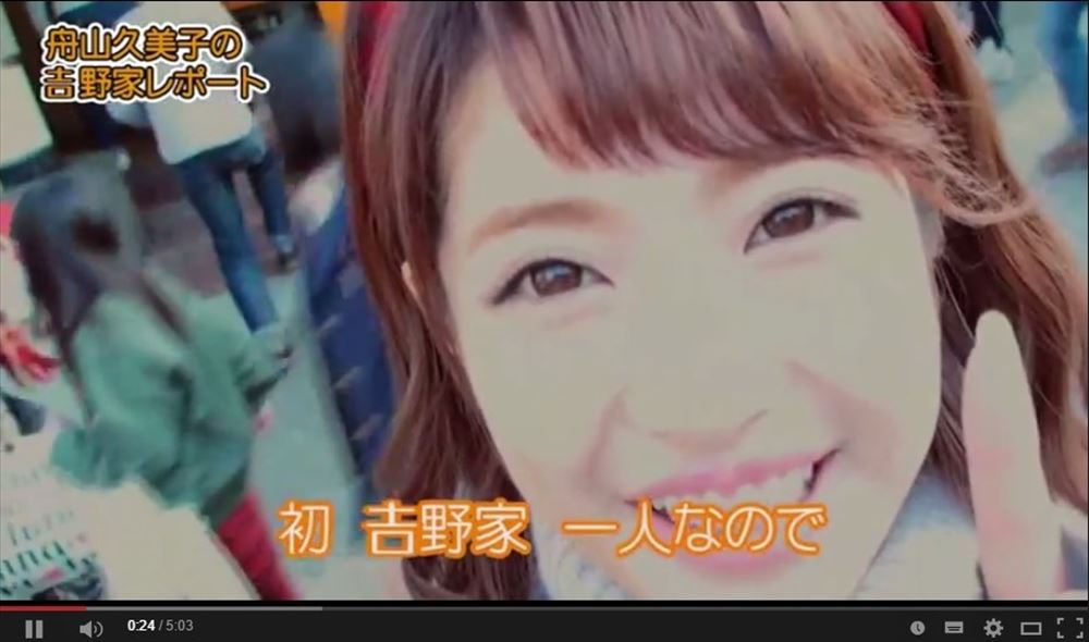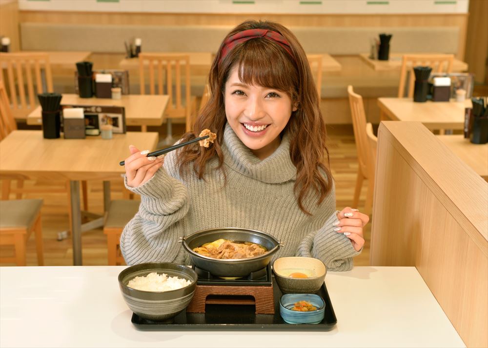 1月7日より、人気モデル・くみっきーこと舟山久美子さんが吉野家の大ヒット商品「牛すき鍋膳」をレポートするオリジナル動画が、期間限定で公開されている。