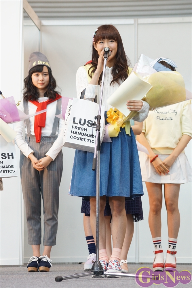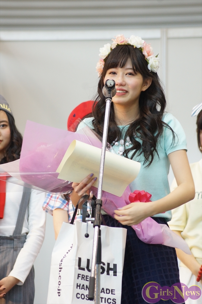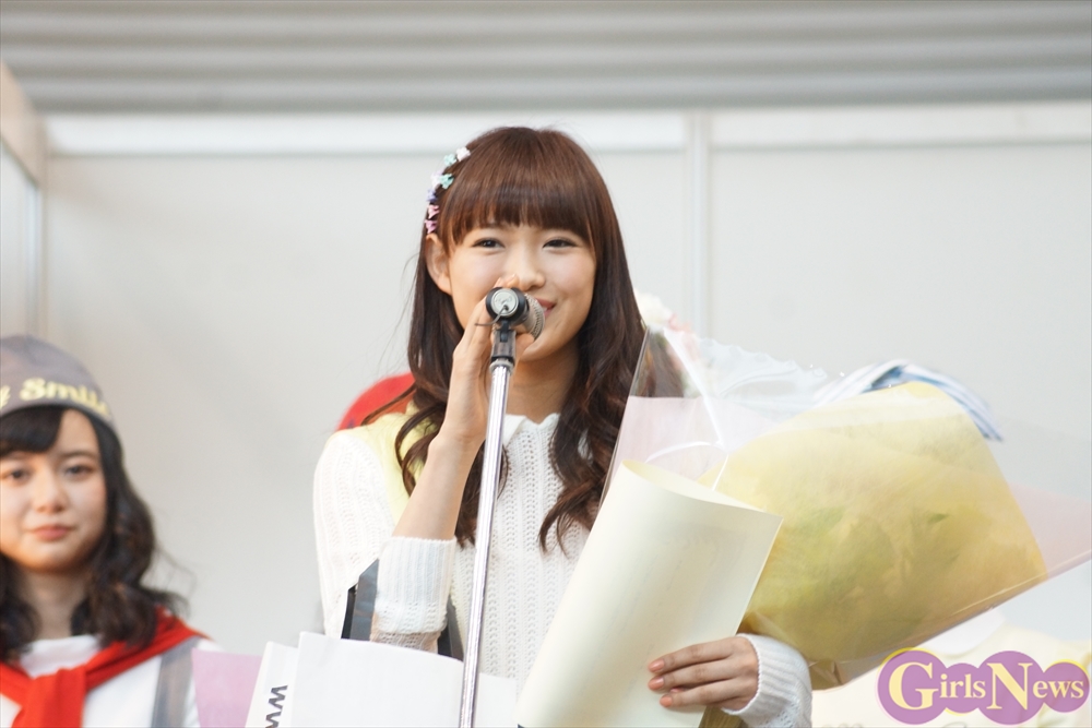 「私も三年くらいピチレモンに出させていただいたんですが、別の雑誌から来たのでピチモちゃん達がどういう子達なのか、どういう現場なのか分からなくてすごい不安でした。初めての撮影の時にりこ(関根莉子)が仲良くしてくれて、そこからピチレモンってみんなすごいフレンドリーで優しい子達ばっかりなんだなって思って、その日からピチレモンがホントに大好きになりました。途中、色んな事があって悩んだし傷ついた事もあったし後悔した事もたくさんありました。それでも私の事が好きって言ってくれる人がたくさんいて、支えてくれるピチモちゃんがいて、スタッフさんがいて、私はここまでこれました。ピチレモンで過ごしてきたこの三年間はすっっごく大きな糧になり大切な思い出になりました。これからもみなさんに忘れられないように精一杯頑張ります。今日はありがとうございました。」
