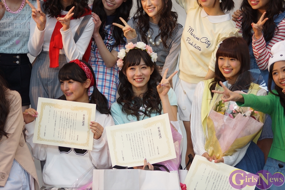 山口乃々華、長崎すみれ、森高愛が一歩前に進み、ピチレモン編集長から卒業証書を手渡される。