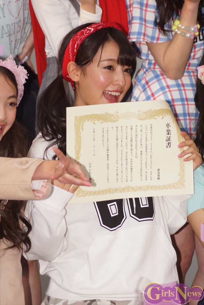 「私はピチレモンのモデルを5年間務めさせていただいて、中学1年生から高校2年生の今までいさせてもらって…ホントに良い経験させてもらってよかったなって思っています。ピチレモンは代々明るくて優しい現場で、先輩と後輩の上下関係とかも無くて、すごくみんながフレンドリーで暖かい現場なので。それをずっと続けていってください。ホントにみんなが大好きなので、毎月あった撮影(が無くなり)で会えなくなっちゃうのはすごい寂しいんですけど…。誌面ではみんなに中々会えなくなると思うんですが、テレビでみなさんにたくさん会えるようにE-girlsとして、これからもっと頑張っていこうと思っていますので、応援よろしくおねがいします。ホントにありがとうございました。」