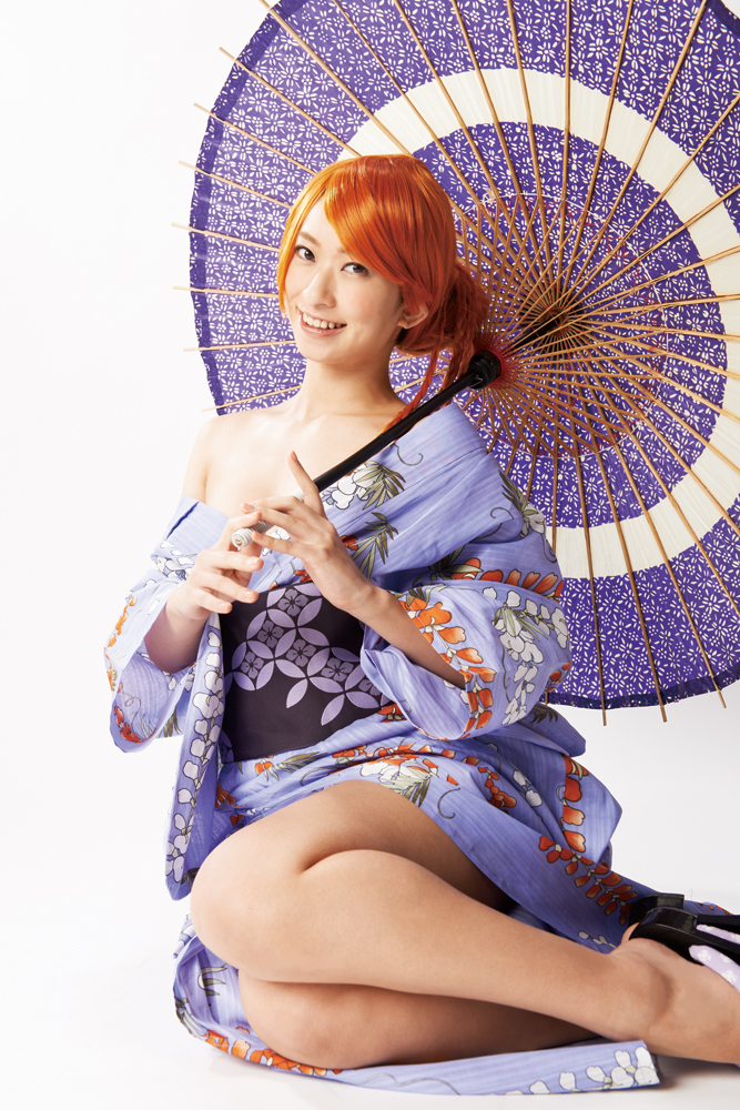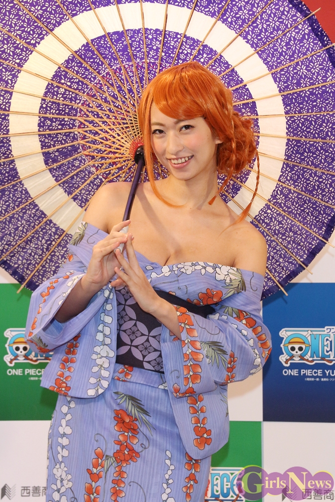 アニメやマンガが大好きでワンピースの原作も全て揃えているという倉持由香さんは、いちばん思い入れのあるキャラクターでもあるナミをモデルにした浴衣を胸元もあらわに着こなして、会場の目を釘付けにした。