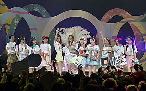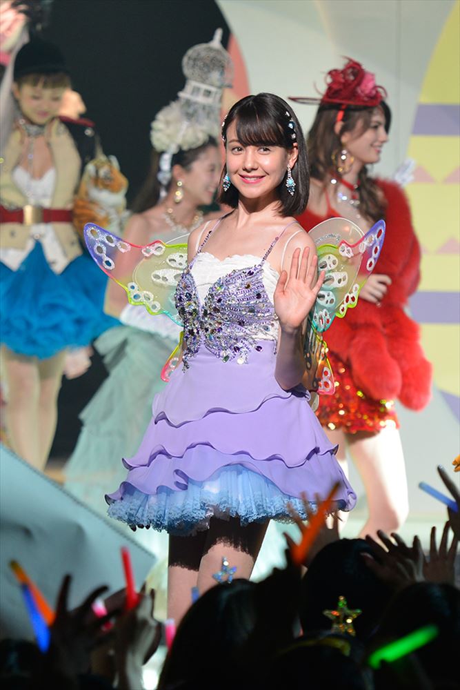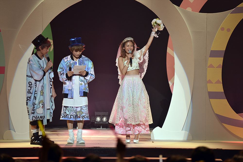 続いてMCの広海深海にうながされ、大石参月がウェディングドレス風の衣装で登場。「このたび、10年お付き合いしていた彼と結婚することになりまして、先日ハワイで挙式してきました」と幸せいっぱいに結婚報告。さらに「ロスのディズニーランドのお城の前で、(指輪のケースを)パカっとしてもらいました」、(それに対して)「もちろんです、と答えました」とプロポーズのマル秘エピソードや、指輪もお披露目。彼と付き合って最初のクリスマスに購入したというペアリングと結婚指輪を重ねづけしていたことを明かすと会場の祝福ムードはさらにテンションアップ。「こんなに盛り上がってもらえて、嬉しいけど恥ずかしい」と照れ笑いした大石参月がブーケトスをして、ハッピーオーラを会場に拡散した。