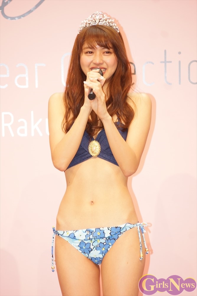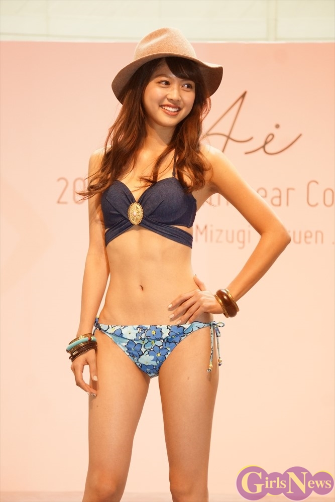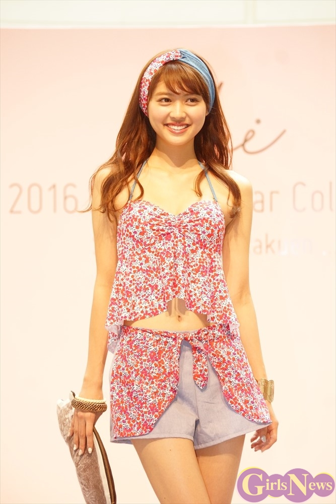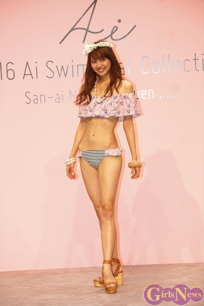三愛水着楽園の新作水着を可憐に着こなした松元絵里花さんが登場し、さわやかな笑顔を見せた。