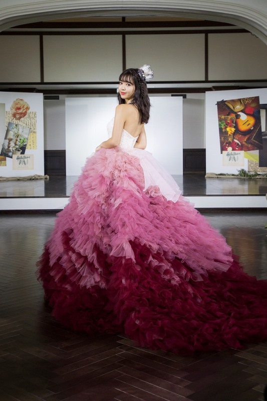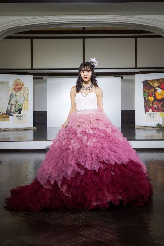 この日デビューコレクションのオープニングで登場したニコルさんは、落ち着いた色合いのグラデーションと、幾重にも重ねられたチュールが個性的なワインカラードレスを身に纏い、普段とはまったく違う大人っぽい表情に。