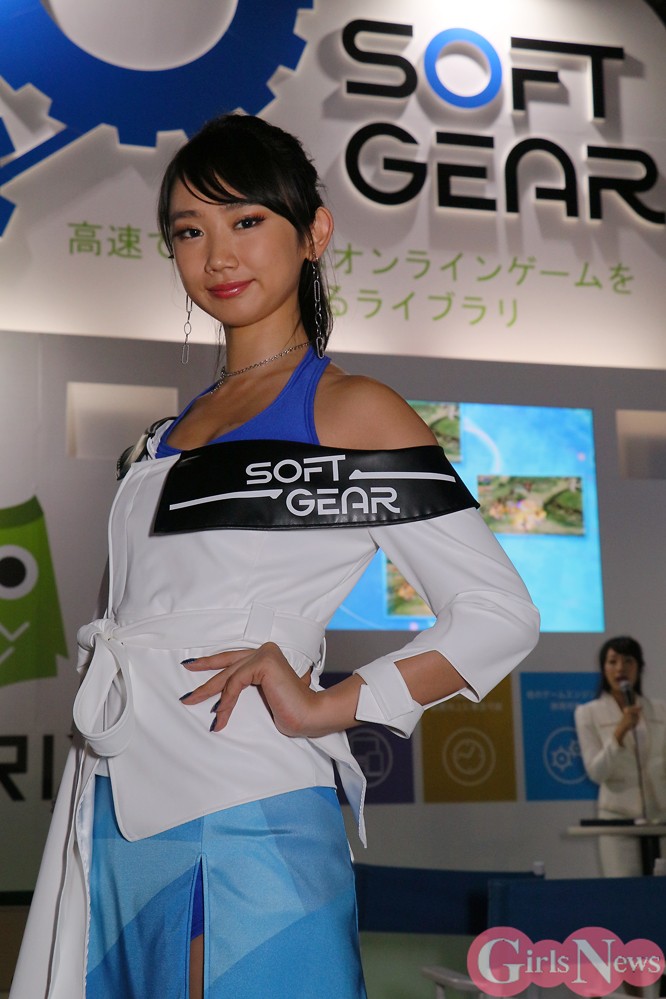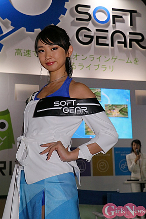 オンラインゲームゲームの開発や、開発向けソリューションを提供するソフトギアでは、カルソニックレディにも選ばれた相沢菜々子さんをはじめ、SUPER GT au サーキットクイーンを務める太田麻美さんなど美人コンパニオンが並ぶ。