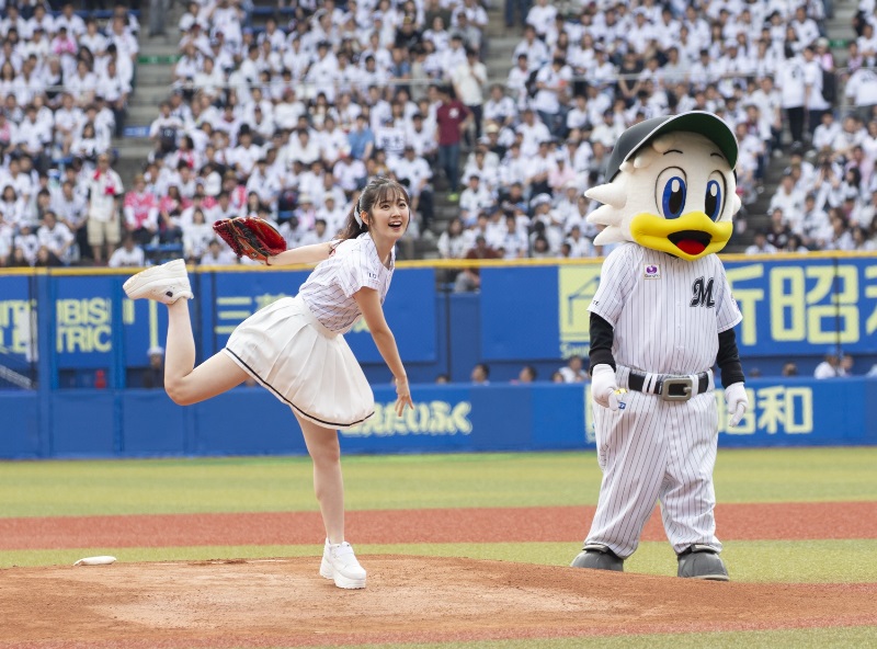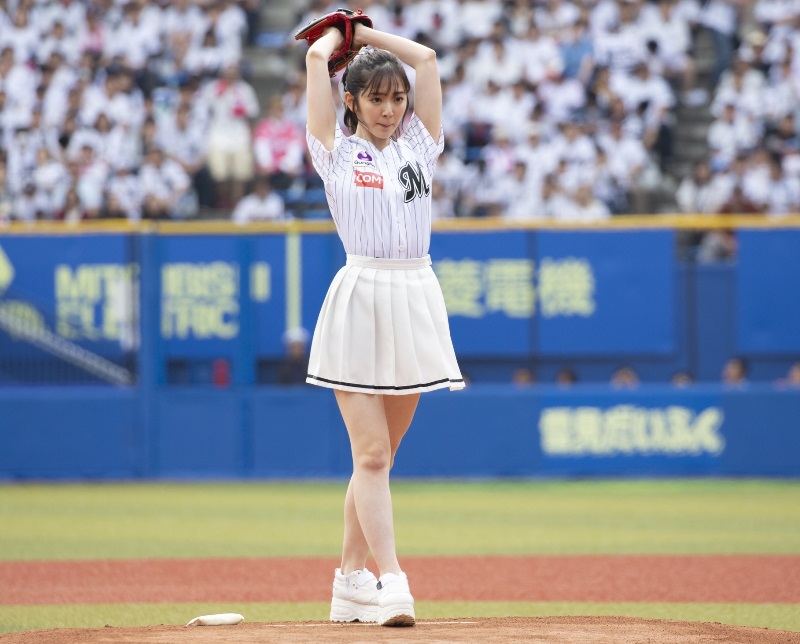 歌手でモデルの鈴木愛理さんが5日、千葉・ZOZOマリンスタジアムで行われた千葉ロッテマリーンズ 対 北海道日本ハムファイターズ戦のファーストピッチセレモニーに登場。 人生初となる始球式に挑戦し、 左足を高々と上げる美しい投球フォームを披露。 ベース手前でワンバウンドしたものの、 まっすぐ捕手に届く投球で試合前の球場を熱く盛り上げた。