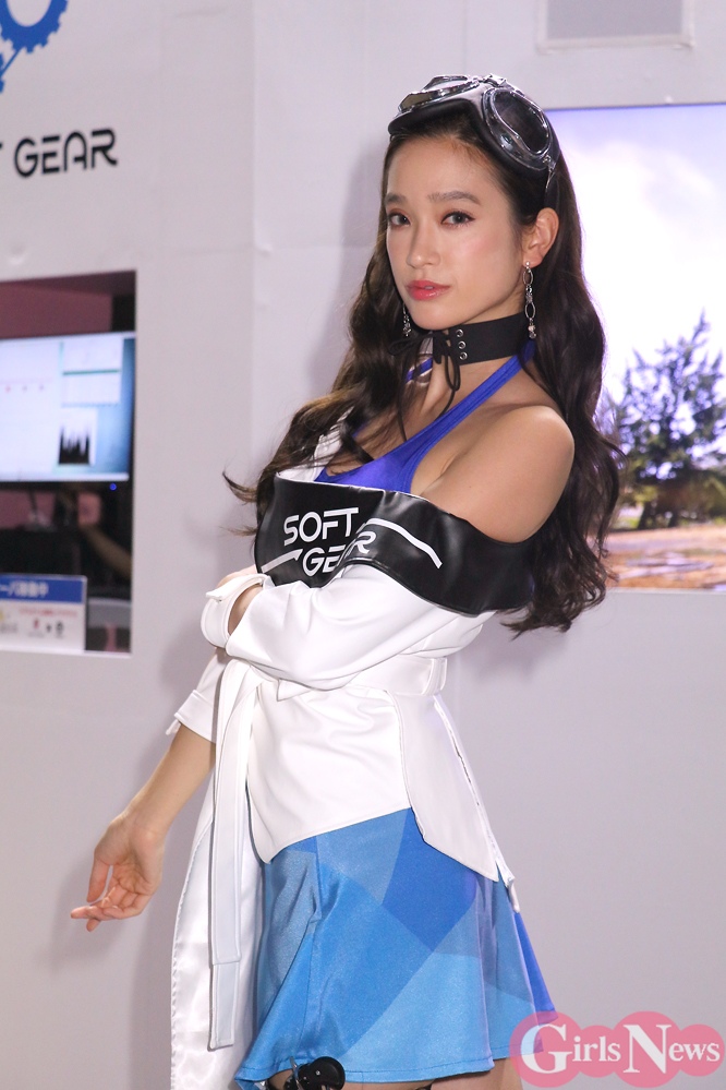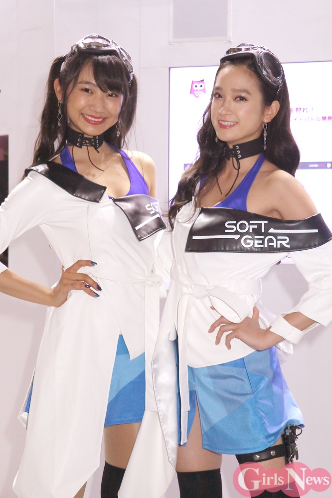 ソフトギアのブースには昨年に引き続き、相沢菜々子さんと太田麻美さんの姿が。長身のスタイルが冴える衣装について「トレンチの形とか、小物のアイテムとか、ゲームショウっぽくって素敵」と太田さん。同じ事務所の相沢さんとはスーパーGTのレースクイーンなど、ほかの仕事でも一緒になることが多く、“170オーバーズ”と呼ばれているのだとか。相沢さんは「一般公開日もブースにいるので、ぜひ見に来てほしい」と呼びかけていた。SUPER GT RAYBRIG TEAM KUNIMITSU のレースクイーンも務める相沢さんだけにブースはかなりの混雑がしそうだ。