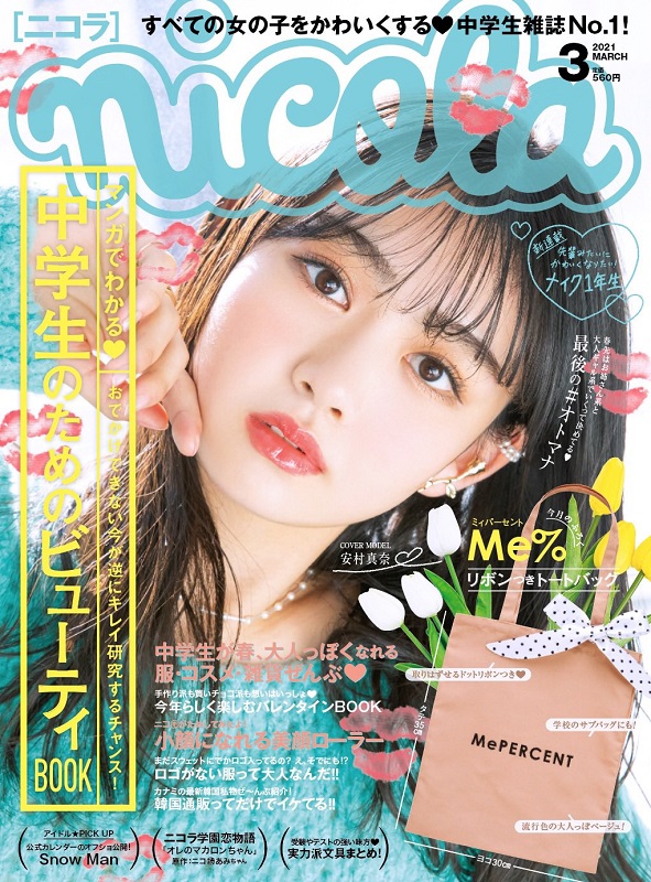 ファッション雑誌「nicola(ニコラ)」(新潮社)の専属モデル・安村真奈さんが、1日発売の3月号にて初めての単独表紙を飾った。安村さんは「小学5年生のときにコンテストを受けてから約5年、はじめてファッション雑誌で”ピン表紙”を飾ることができました!今まで届きそうで届かなかった夢が叶い、本当に嬉しいです!」と喜びを表している。