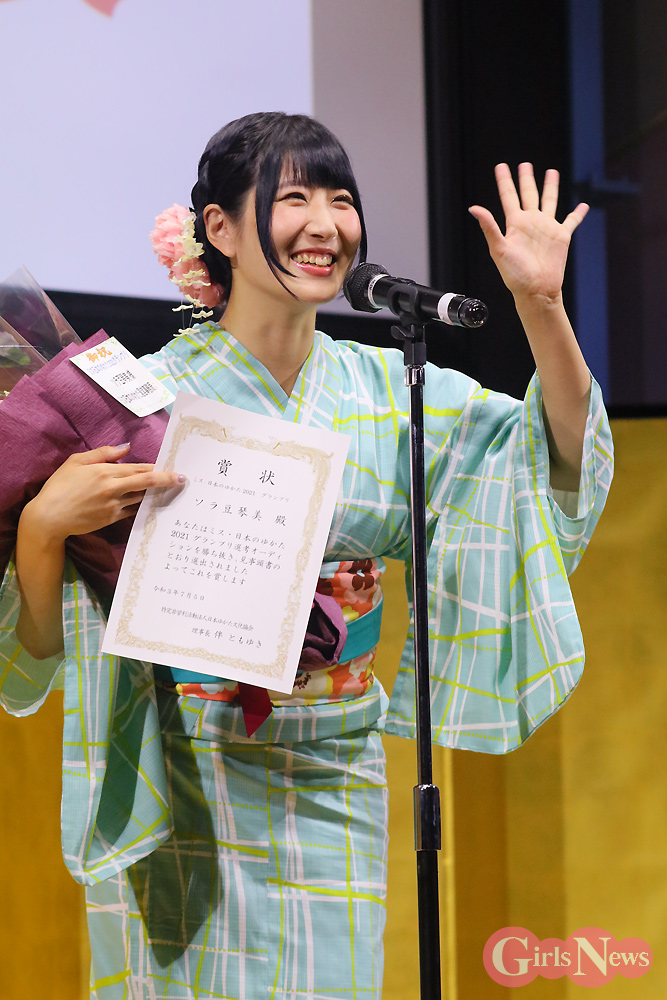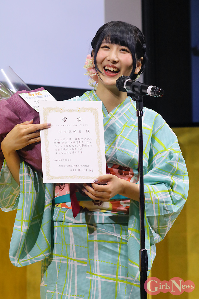 グランプリを獲得したソラ豆琴美さんは、これまで参加してきたミスコンでは3位どまりだったことを明かし、「ずっと1位になりたかったので、大好きな浴衣を着ることができる賞で1位をいただけて嬉しい」と念願の受賞にニッコリ。