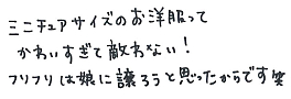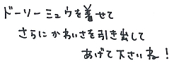 吉川ひなのさんは子供服をプロデュースしようと思ったきっかけについて「ミニチュアサイズのお洋服ってかわいすぎて敵わない!フリフリは娘に譲ろうと思ったからです。」とコメント。ファンに「ドーリーミュウを着せてさらにかわいさを引き出してあげてくださいね!」と直筆メッセージを寄せた。