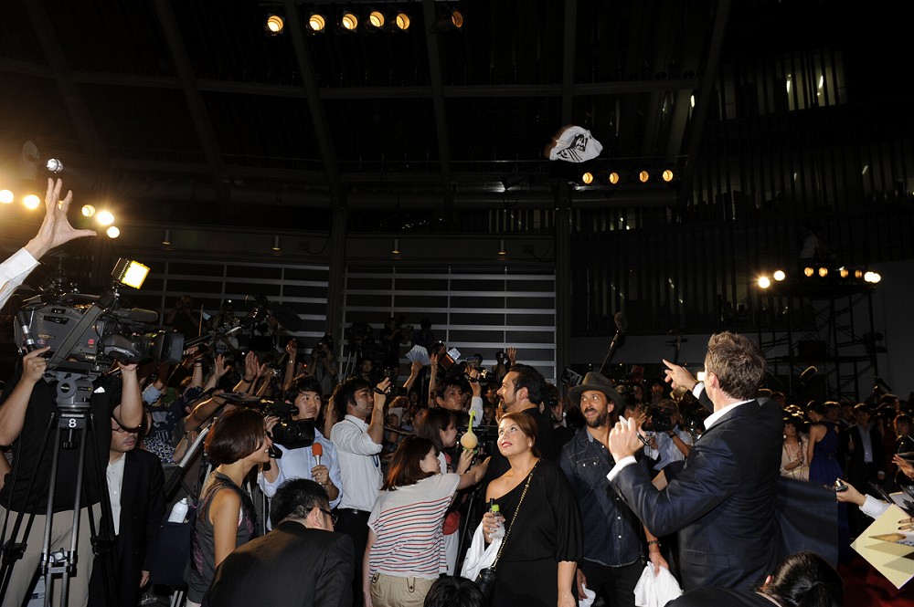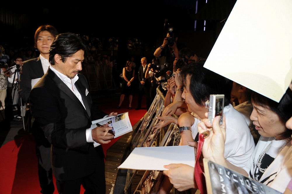 会場となった六本木アリーナには、ヒューの熱いSAMURAI魂をカメラに収めようと、なんと150台ものムービーと、60台のスチールが日本中から集まり、近年まれにみる壮大なプレミアとなった。会場には日本が舞台の本作にちなみ、瓦屋根の日本屋敷が設置された。場内が暗転すると、奥の障子に侍と忍者の姿が。間合いを詰める両者。その緊張が頂点に達した瞬間、壮絶な殺陣がスタート。なかなか決着がつかず、こう着状態に陥る両者。するとウルヴァリンのテーマが壮大に鳴り響き、屋敷の屋根から徐々にヒューが表れた。と同時に、炎が屋根から舞台へと走り、ステージに炎の火柱が上がった。その瞬間、映画さながらの大迫力の演出に思わず集まったファンからは大きな歓声が上がった。続いて、ウルヴァリンと壮絶な死闘を演じた真田広之さん、本作のヒロインでウルヴァリンと恋に落ちるTAOさん、そして本作でヒュー・ジャックマンの相棒役でもある福島リラさんと監督のジェームズ・マンゴールドが登場するとアリーナの興奮は最高潮に達した。