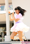 ところが、トークが始まり「どうもありがとう!小池、ラゾーナ川崎に来るのが初めてなんだけど、みんなはどーですかぁ?」と大声で呼びかけると、例によってファンは手を返したように“し~ん…”とした態度をみせる。それに対して小池美由さんが健気に「ハイ、ありがとうございます。」と切り返すとあちこちでクスクスと笑いがおこった。ファンのツンデレに対するいわゆる“干され芸”ではあるが、常連に囲まれた会場ならともかく、初めて目にする一般のお客さんが大勢いる前でこのやりとりを披露するのはかなり勇気のいることだろう。しかし、小池美由さんは、よほど心臓に濃い毛が生えているのか、全く物怖じした様子は見られなかった。