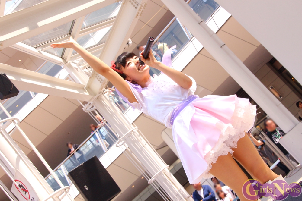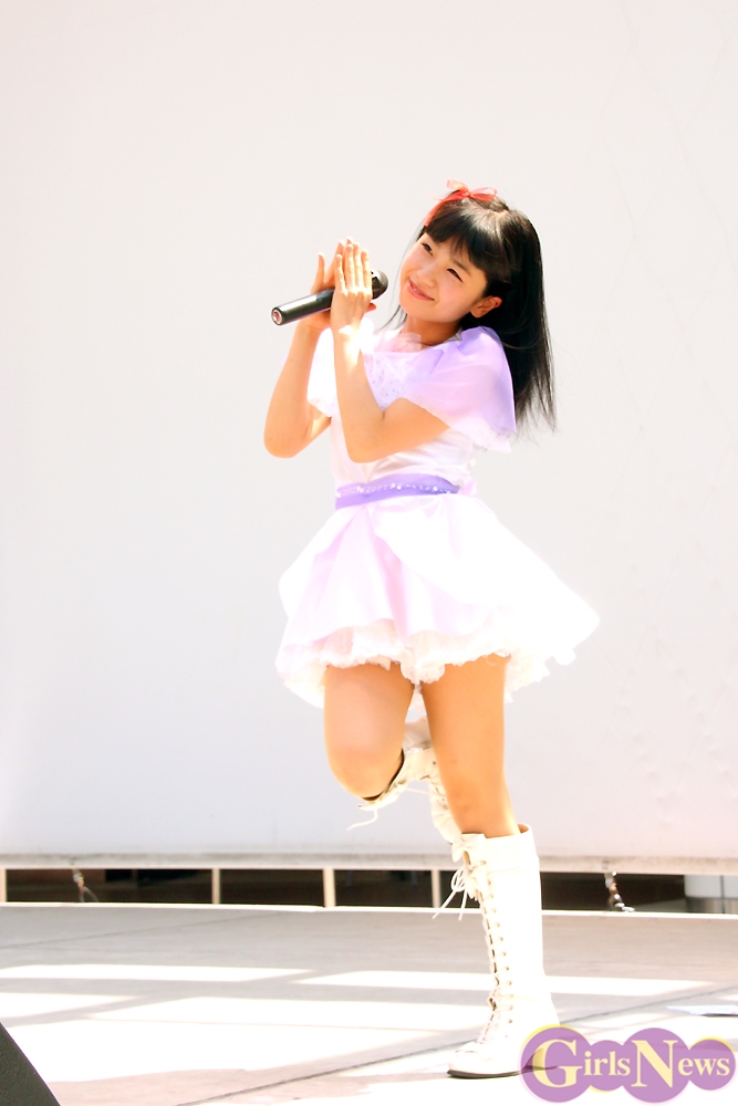 しかし、小池美由さんがステージに躍り出ると、雰囲気は一変して広い広場がいつものライブ会場のような熱気に包まれた。1曲目の「大好き」で小さな体でステージ狭しと跳ねまわると、会場からは掛け声と小池コールが湧き上がって、通りすがりの一般客も何事かと足を止めるほどの賑わいぶりだ。