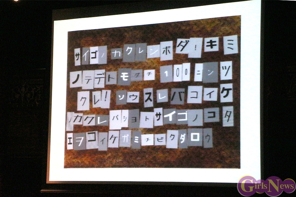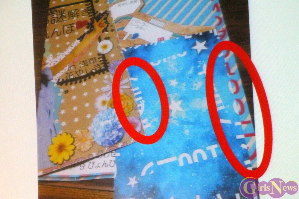 小池美由さんと一緒に問題の解説してくれたのは、謎解きイベントの制作団体UniBirthさん。ひとつひとつ解答が明かされ、ついに最後の問題の謎解きがされた。小池美由さんも、「みんな難しかった?小池もやってみたとき全然分からなくて、めっちゃムカついた。今日は暑かったからみんながイライラするんじゃないかとビクビクしちゃった。」というほどの難問の答えは、問題の用紙とパンフレットを組み合わせて文字を読めるようにすると、表紙の小池美由さんの写真が指差すところに、隠れ場所と合言葉が示されていたのだ。会場からは感心とため息の混ざったような声が漏れた。