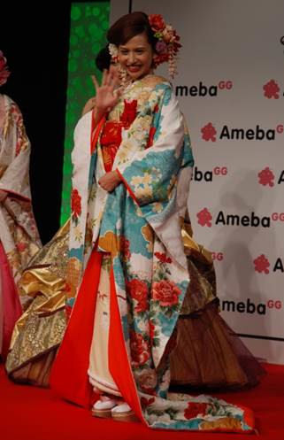 人気ランキング1位の衣装の発表時には、白地に赤が映える艶やかな色打掛を身にまとったタレントの水沢アリーさんが登場!テレビで見る元気な姿とは違う妖艶な水沢アリーさんの姿に、会場から驚きの声があがった。「色打掛を着るのは初めて」という水沢アリーさんは、「よく姿勢が悪いって言われるけど、着物着てると姿勢が良くなって、女度があがった気がする!」とコメント。また、「こんなに素敵な衣装を着てると、結婚したくなっちゃうね~」「3年半以内に結婚するのを目標にしようかな」など結婚願望も語り、会場を沸かせた。