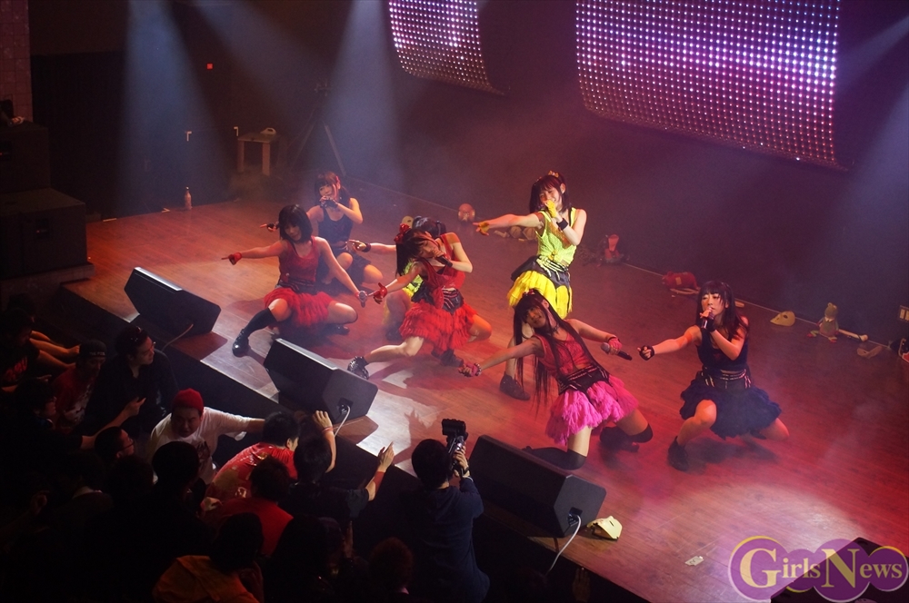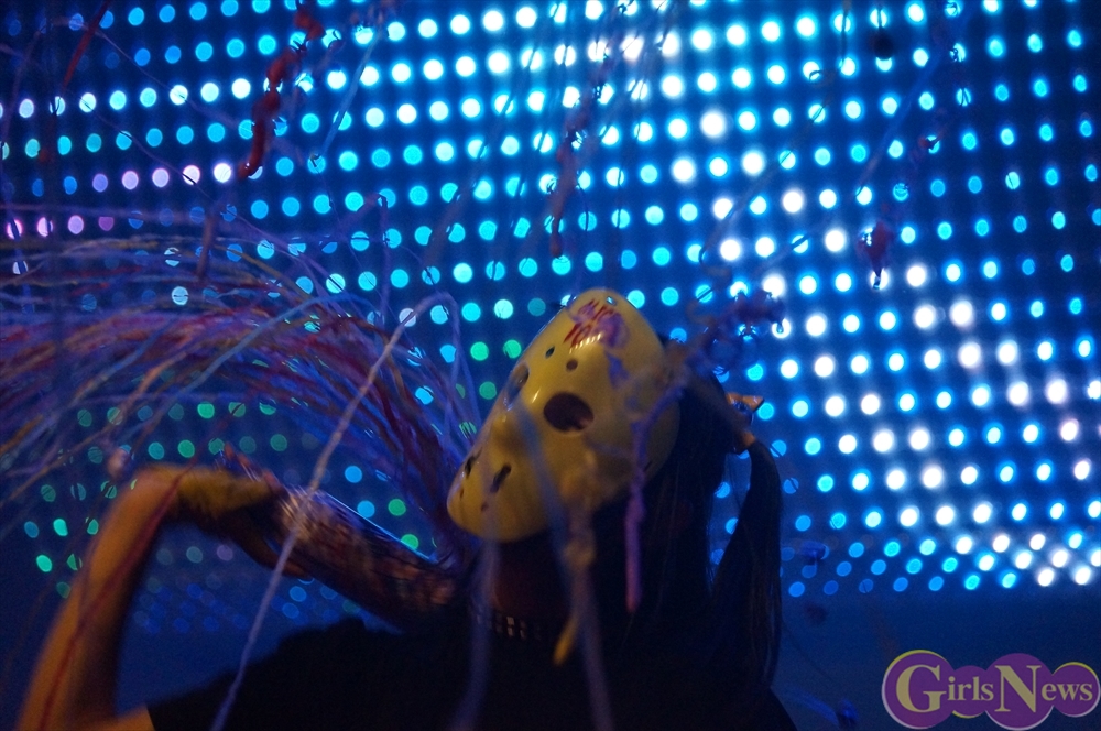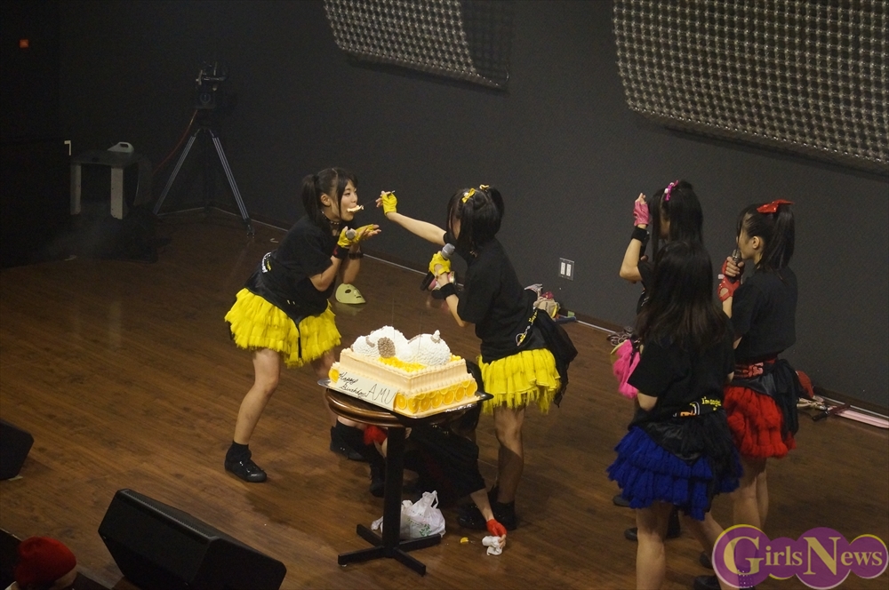 自己紹介の後は、再度ライブパフォーマンスが披露され会場の盛り上がりも徐々に最高潮へ。そんな時に楽曲が途中でいきなり止まり、愛夢さん以外のメンバーがうつ伏せの状態で止まったままに。愛夢さんが不安そうにしていると、突然「ハッピーバースデー」の合唱。他のメンバーによるサプライズだ。