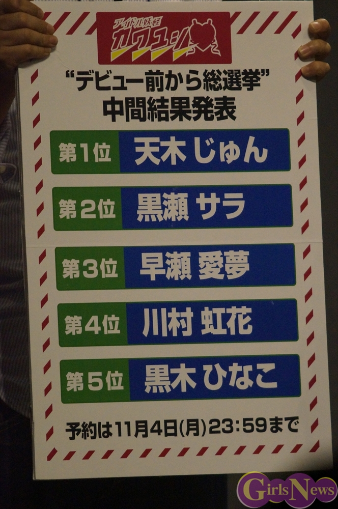 1位となった天木じゅんさんは「ここまで来るのにたくさんの試練を乗り越えてきました。私1人の力だけでなく、たくさんの人に支えられてここまで来たので、中間発表で1位という結果をいただいたんですが、これからもあきらめないで粘り強く頑張っていくので、みなさん応援よろしくお願いします」と喜びの表情でスピーチ。2位の黒瀬サラさんは、「予想にない結果で本当にありがたい。まだ上にも行ける訳なので、皆さんあともう少し力を貸してください」と。そして3位の早瀬愛夢さんは、「一難去ってまた一難。戦いは一生続くと思うのですけど、いまは真ん中(3位)にいるけど、本当のセンターになりたい。この後、残り少ない期間ですが応援よろしくおねがいします。」と力いっぱいにアピールした。川村虹花さんは「中間発表で4位ですが、ここまでこれたのも皆のおかげなので最後まであきらめないで頑張りたいと思います」。最後に5位であった黒木ひなこさんは「このユニットに参加するときに、自分がセンターになりたいと簡単に言っていいのかわからなくて、自分がメジャーで戦える実力があると思えなくて、でも『アイドル妖怪カワユシ♥』に入って2か月間、真ん中に立ちたいという思いが強くなって、今日はこういう結果でしたが、まだチャンスが残っていると信じて頑張っていくので応援よろしくお願いします。」と涙ながらに語った。