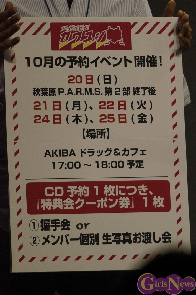 10月20日、アリスプロジェクトのアイドルユニット・『アイドル妖怪カワユシ♥』の初お披露目が秋葉原の常設劇場 P.A.R.M.S(パームス)で行われた。