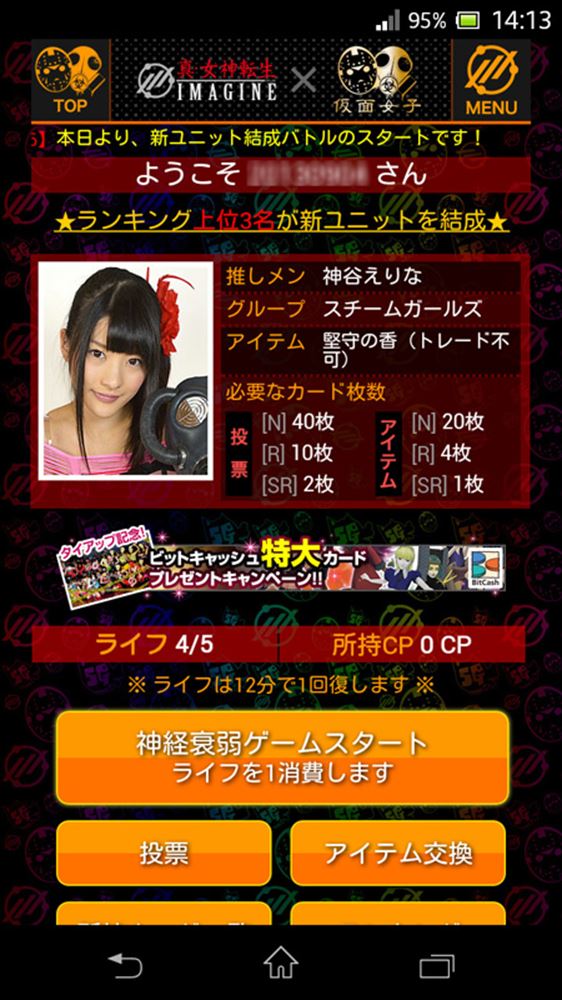 ミニゲームで手に入る“カード”を集めると、お得にゲーム内アイテムが手に入る。スマホでのキャンペーンということで、外出先でも気軽にプレイすることができそうだ。また、“カード”を使って「仮面女子」メンバーの人気投票に参加することが可能。タイアップ期間終了後、ランキング上位に選ばれたメンバーは「真・女神転生IMAGINE」タイアップソング第二弾となる『ハル・メギド』を正式に歌うユニットに参加することができる。