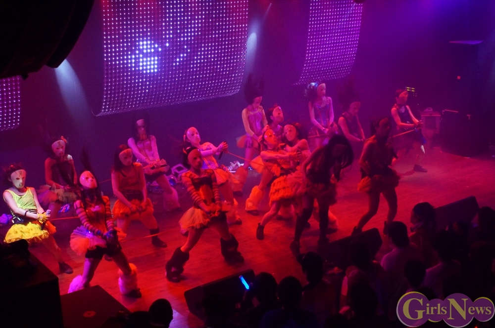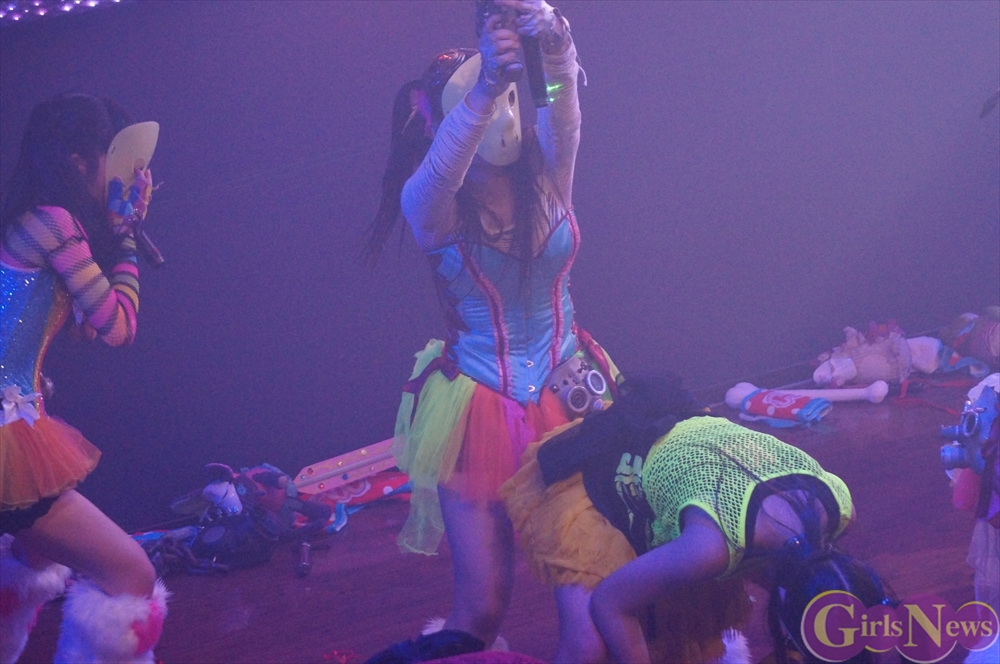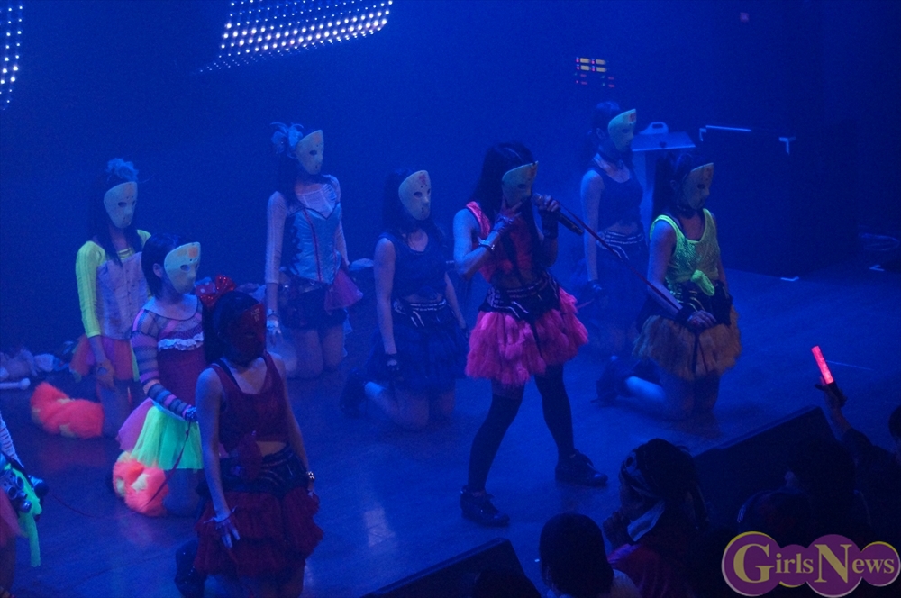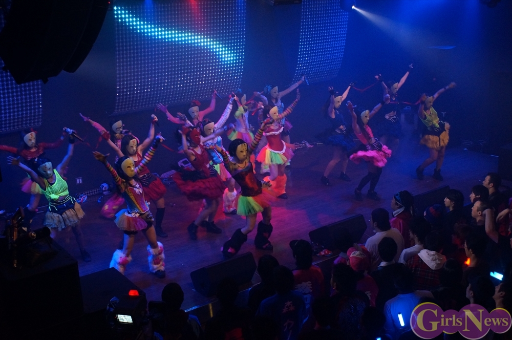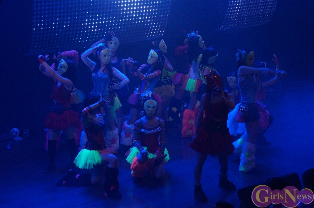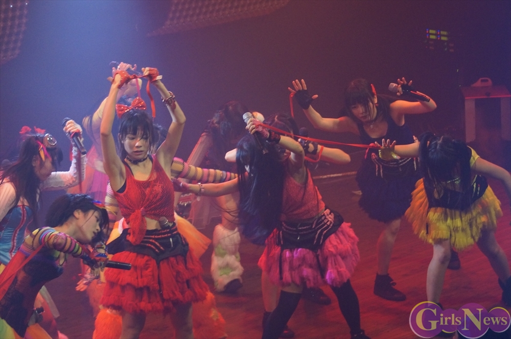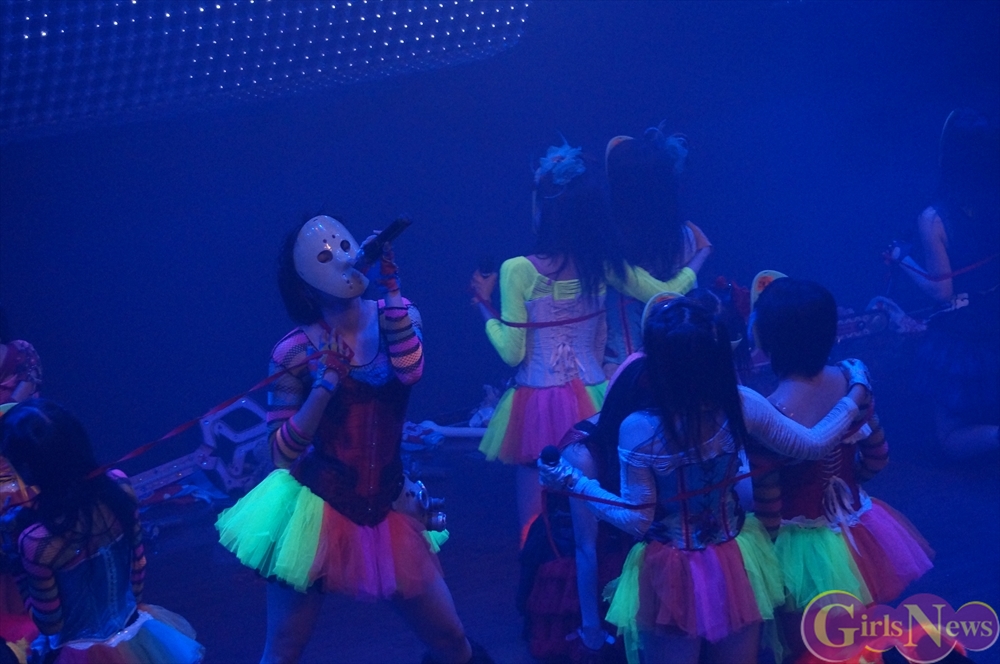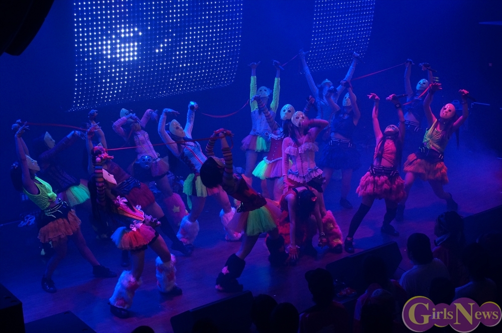そして、ついにこの日、アリス十番とスチームガールズの2組が合体した仮面女子が「妄想日記」を初披露!この曲はシドのカバー曲だが、仮面女子では赤い糸を使った演出で、1つの赤い糸をメンバーがペアとなり繋がりながらダンスするという高いチームワークが要求されるパフォーマンスを見事に披露し、ファンの度肝を抜いた。