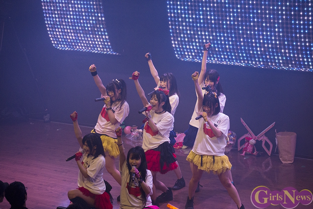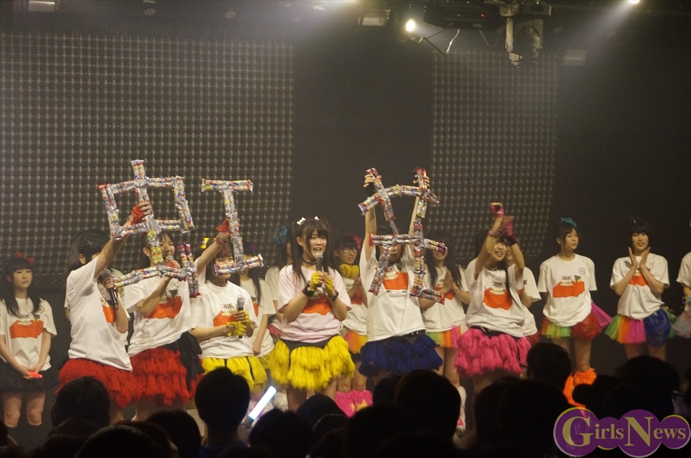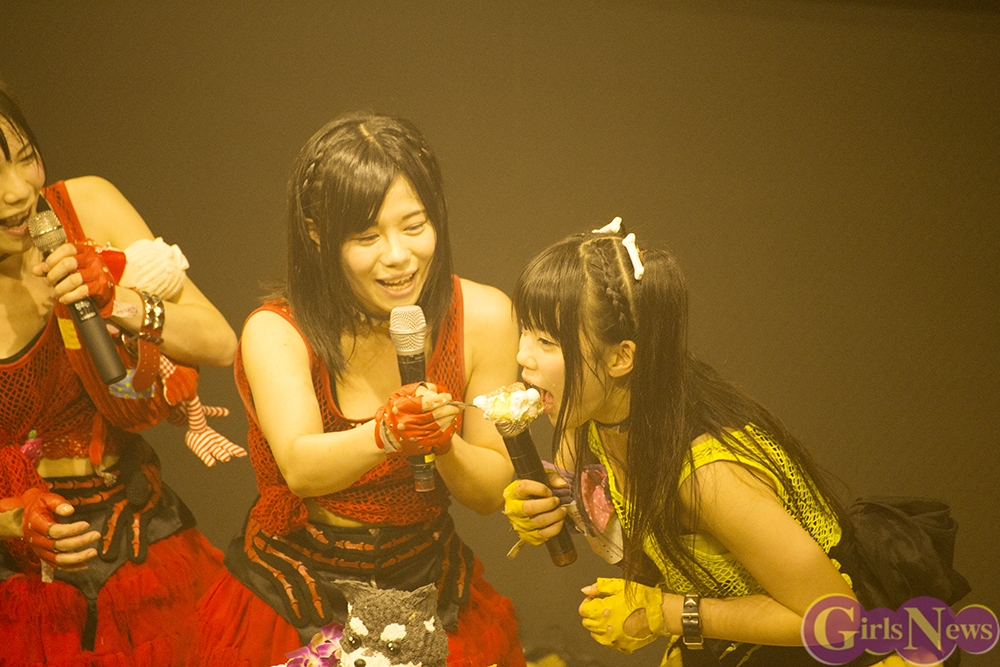 再びライブパートになると「ハピ☆バデ」では、メンバーが1人18本ずつ買ってきて全部で108本あるうまい棒で作られた「虹花」の文字で生誕をお祝い!