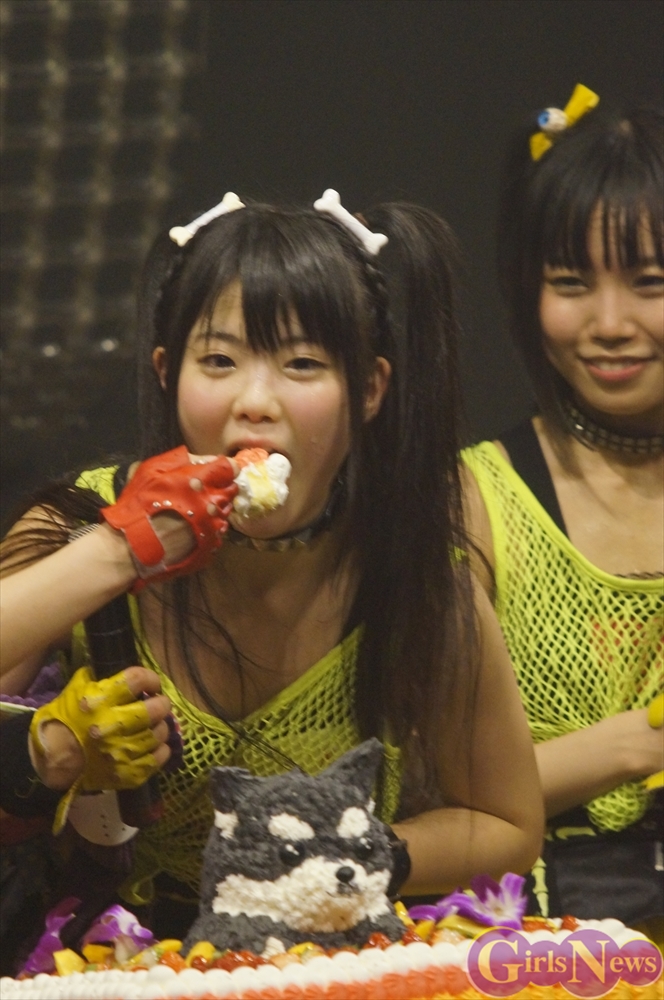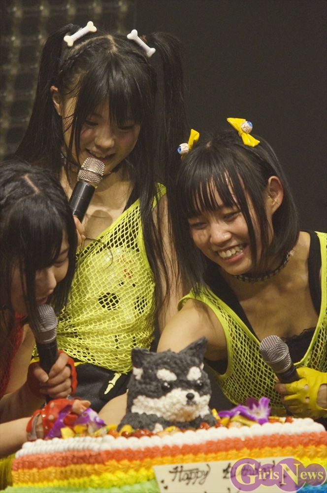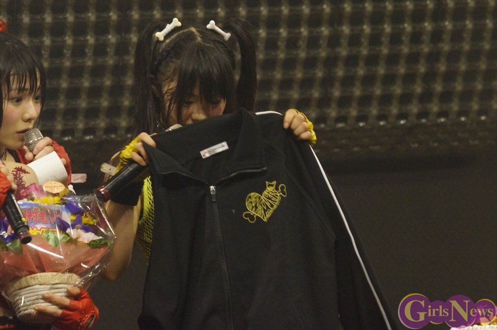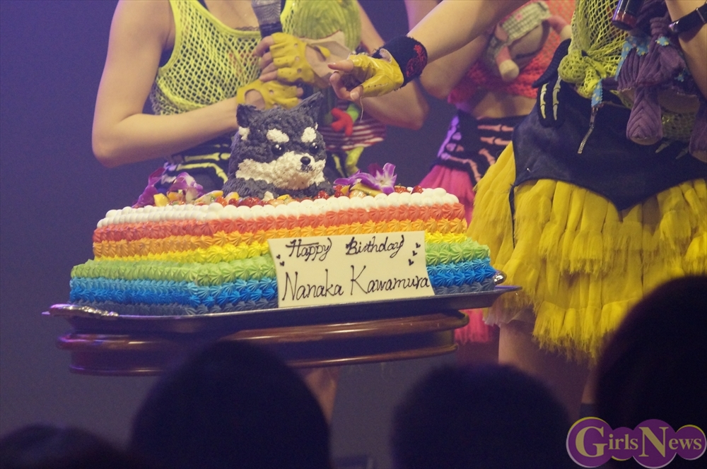 恒例の生誕祭プレゼントでは、「夏だね☆」の曲の最中に客席の後方からステージに向かって通路ができ、生誕ケーキがその通路に作られたアーチの中をくぐり抜けて登場!ケーキは川村虹花さんの愛犬チョコを模して作られていて、川村虹花さんの虹色のデコレーションも入っている可愛らしい作り。そのケーキを森カノンさんが「あーん」と言って川村虹花さんに食べさせると、その頬張る姿にファンはメロメロ。ファンからの花束やヲタ図鑑、フォトアルバム等がプレゼントされ、今回は生誕Tシャツに加え、生誕ジャージ、さらに愛犬チョコの服もプレゼントされた。
