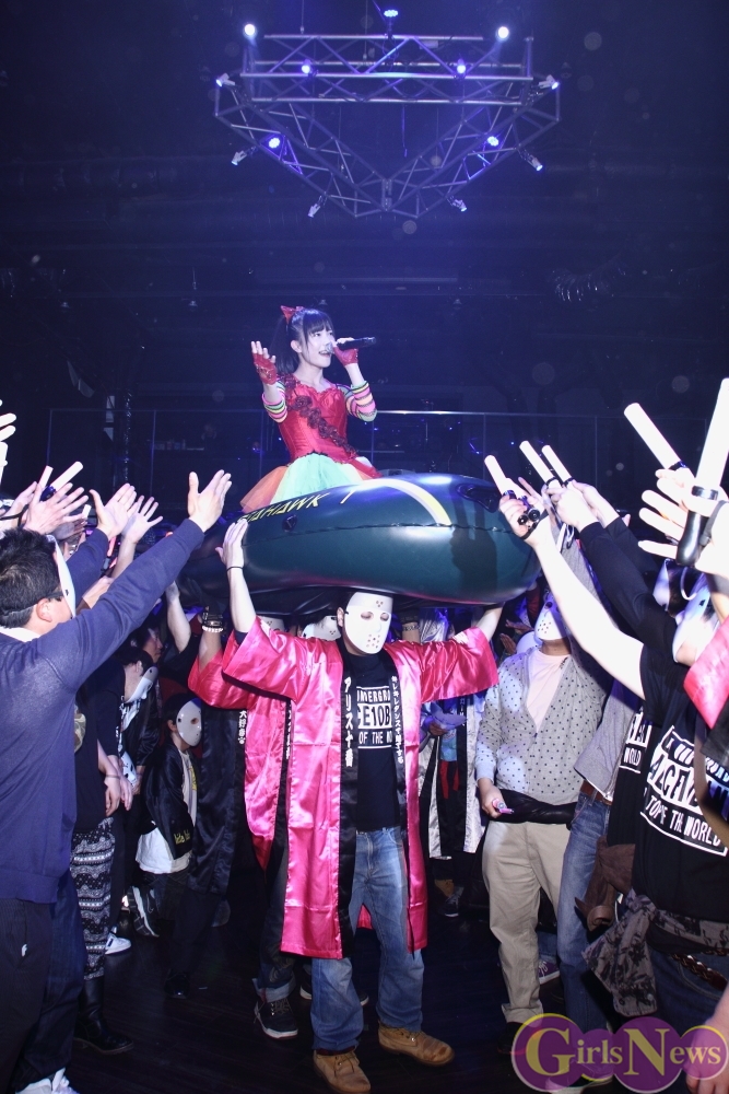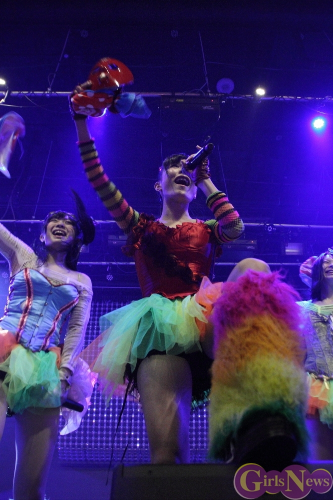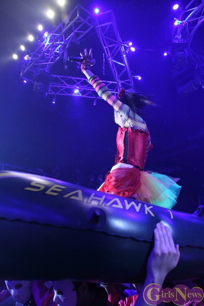 トレードマークの赤いマスクを被り、「夏だね☆」の楽曲では、ゴムボートに乗り、ファンの上を大航海! そして、日本武道館のライブでも披露した「大冒険」を披露した。