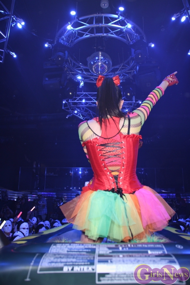 仮面女子の応援団長に就任したデヴィ夫人は仮面女子たちに「衣装も虹色で素敵だけど、もう少し大人の女みたいなセクシーさのあるような衣装も着た方がいいかなと思うわよ。すっきり身体の線が出るタイツ? (ファンを見て)この方たち失神しちゃうんじゃない? (踊りながら)バリッと剥がしたらタイツだったというのはどうかしら。ブロードウェイで踊ってるような感じで素敵だと思います。それにはもっとダンス勉強しなきゃ。」と次々とアドバイス。