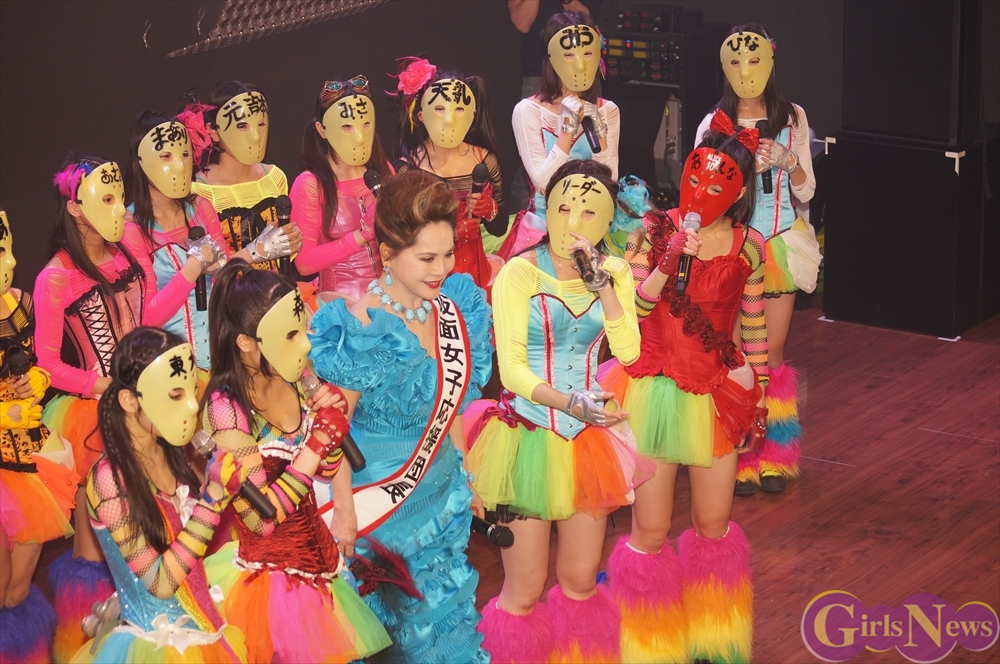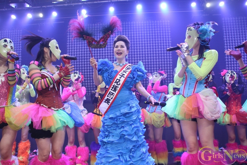 彼女たちの頑張りをYouTubuの動画を見て知ったという、デヴィ夫人が仮面女子の応援団長として舞踏会に出る時に使うような華麗な仮面を着けて登場。