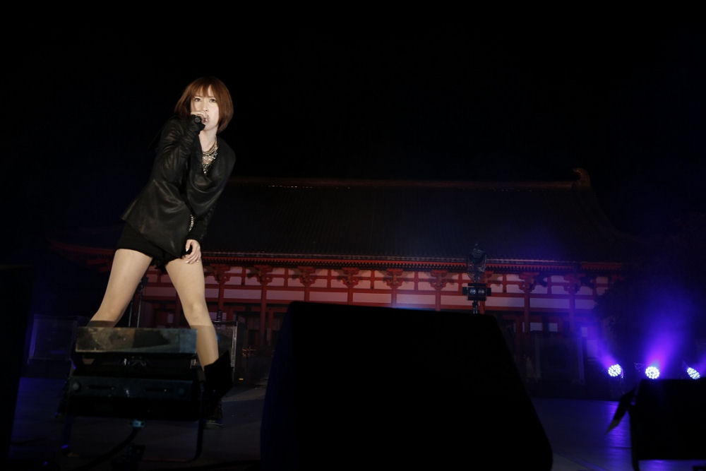 日も落ち、ライトアップされた平安神宮の幻想的な姿を背負いながらステージに、この日3番手として藍井エイルが登場すると、会場からは社殿を揺るがすような歓声が上がった。