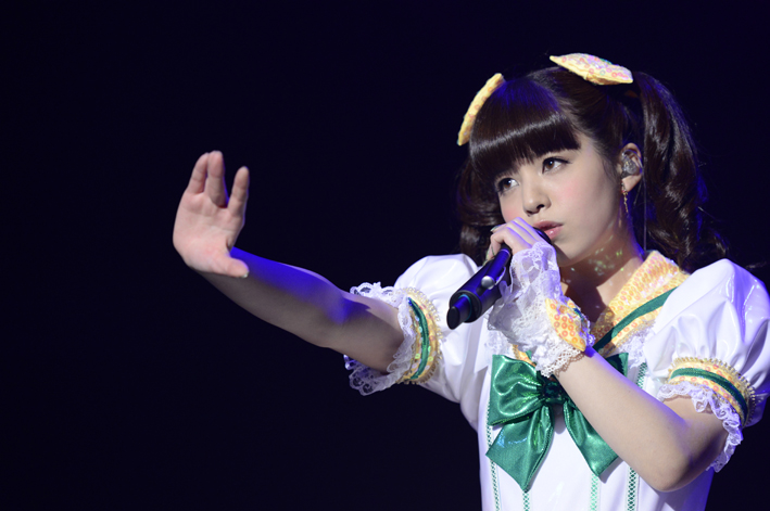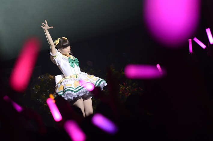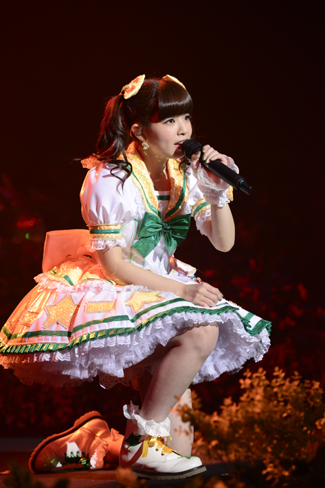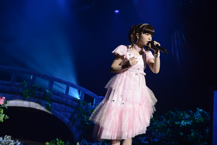 もうすぐクリスマスということでキュートなサンタ衣装でステージに登場すると「snowdrop」を熱唱。続けてステージの前の薄い幕が上がり、ピンク色のドレス姿になり「微熱の月」を披露。