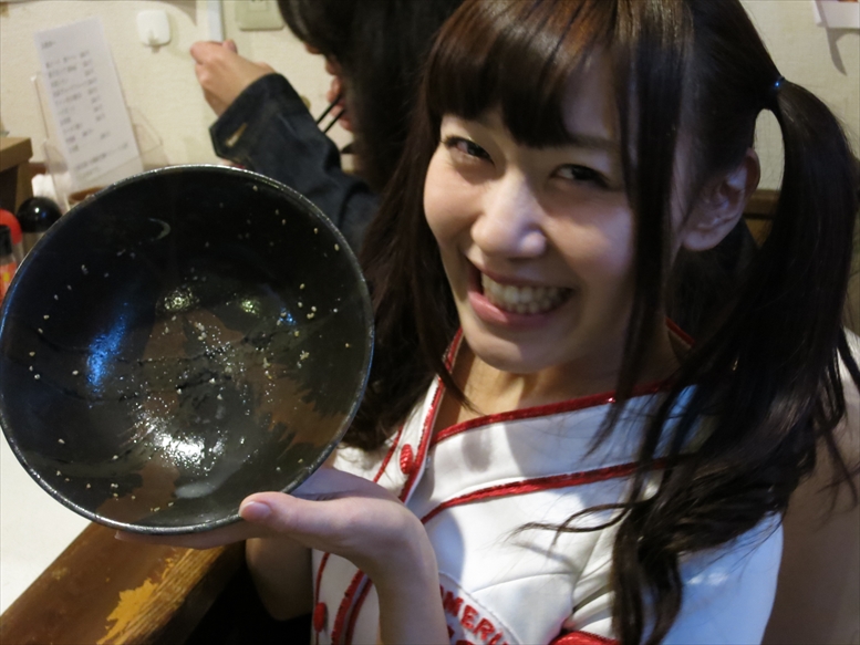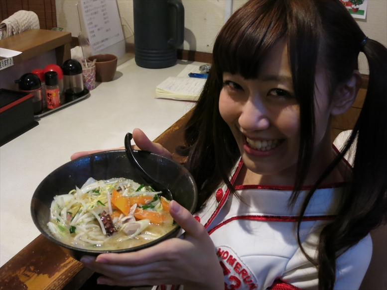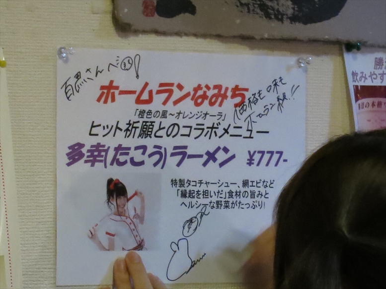 そのコラボラーメンに、舌鼓をうったホームランなみちは、つゆも残さず完食すると、「まさに、味もホームラン級でした。なんか私、元気でてきました。ポニーさん、私の為に、こんな素晴らしい縁起物を作ってくださりありがとうございました。」と感想を述べると店内に貼ってあった、商品POPに、「味も価格も、まさにホームラン級」というメッセージと一緒にサインをした。