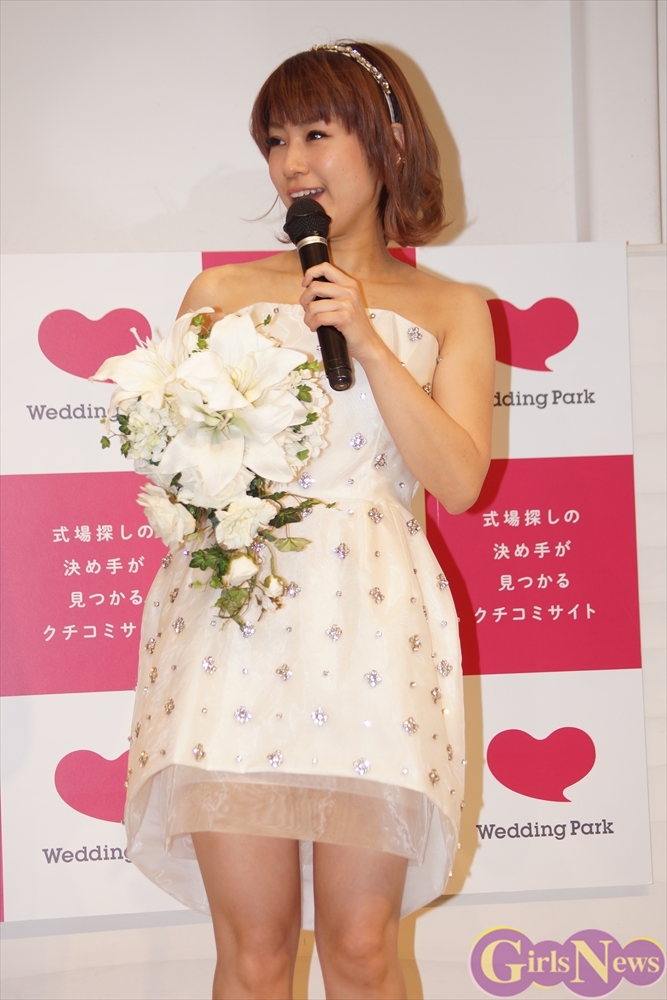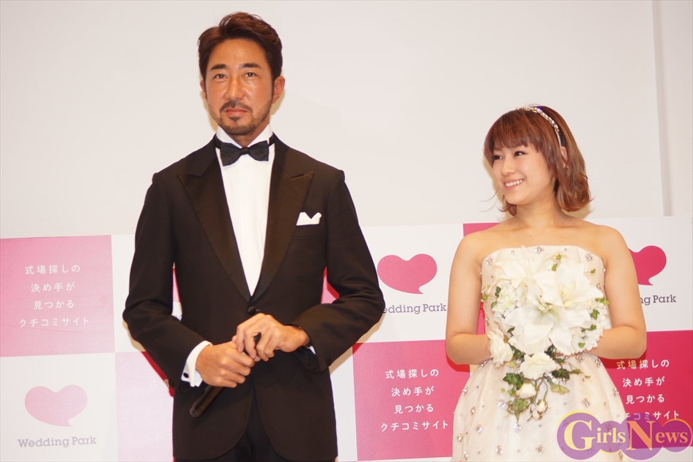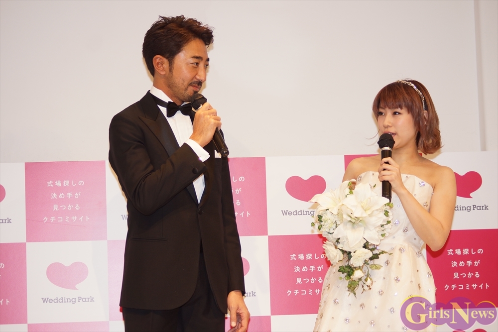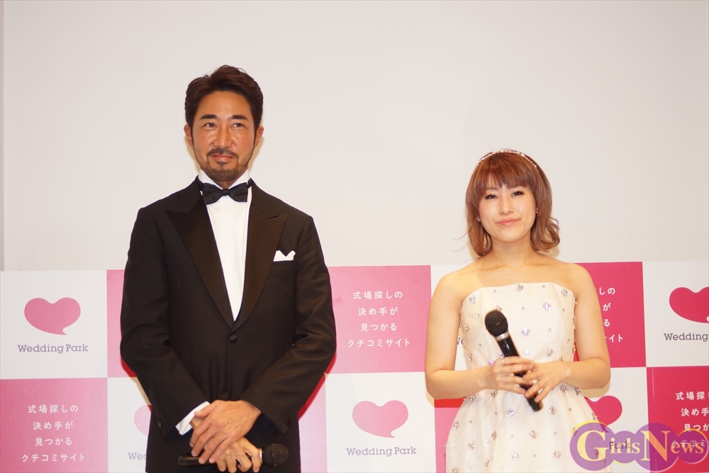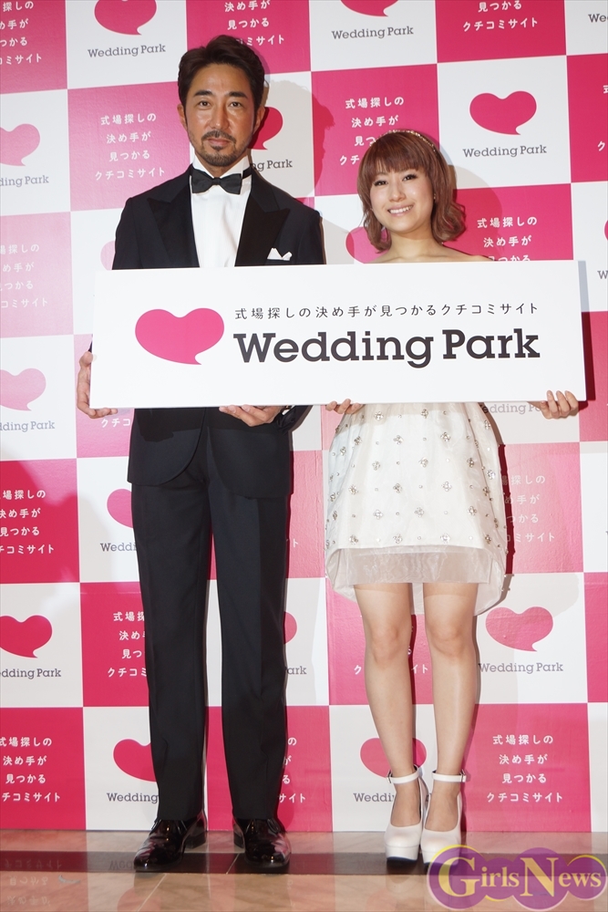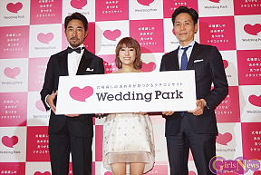 1月20日、式場探しの決め手が見つかるクチコミサイト「ウエディングパーク」のWebCM記者発表会がローザブランカ表参道で行われ、スペシャルゲストにタレントのIMALUさんがウェディング用のミニドレス姿で登場。父親役としてスタイリストの干場義雅さんがタキシード姿で出席した。