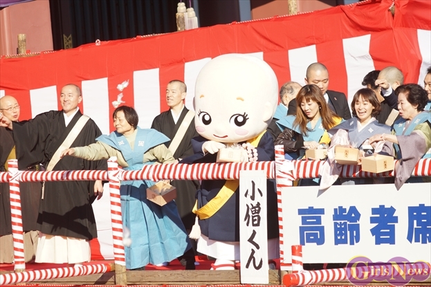 その後、大堂前特設桟橋から鐘の音の合図で一斉に豆まきがスタート。小池美由さんはとびきりの笑顔で駆けつけた人たちに向かって豆をまいていた。
