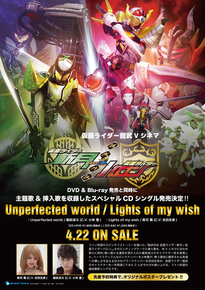 ファン待望のスピンオフストーリーを描いた、「鎧武外伝 仮面ライダー斬月/仮面ライダーバロン」。そのエンディングテーマと挿入歌を、本Vシネマに合わせ新たに制作。戦い続ける運命を受け入れた駆文戒斗のキャラクター性を表現した、ハードミディアムなロックナンバーを小林豊が、戦う運命に翻弄される男達への優しさを伝える壮大なバラードナンバーを志田友美が、仮面ライダー鎧武のキャラクターを1年間演じてきた2人がそれぞれ歌い上げる、ファン待望の鎧武最新シングルとなりそうだ。