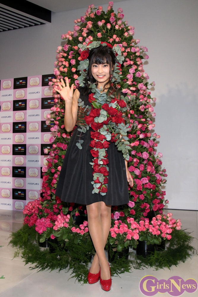 本物のバラで作られた髪飾りで登場した小島瑠璃子さんは会場のバラの大きなツリーに驚きつつ、「すごい素敵ですね。バラは華やかで、女性が誰でもときめく花です。」と声を弾ませ、漂うバラの香りに酔いしれた。