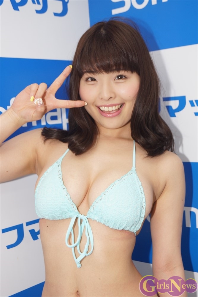 DVDの内容について「ジャケットのオレンジの水着はおっぱいの形が丸見えってぐらい際どい水着になってるのと、ブルーの眼帯水着がいろんな方向に出ているので、そこをチェックしていただきたいのと、黒い水着が横が出ているタイプの水着なので、こういうタイプの水着は初めてだったのですごくドキドキしながら撮影しました。」と紹介。