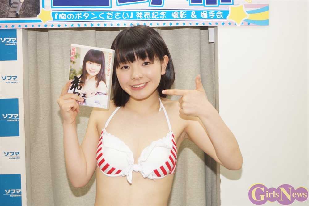 4月29日、グラビアアイドルの星野希さんのDVD「胸のボタンください」(イメージクリエーター)の発売記念イベントが秋葉原のソフマップモバイル館で行われた。