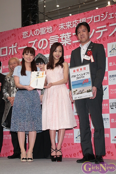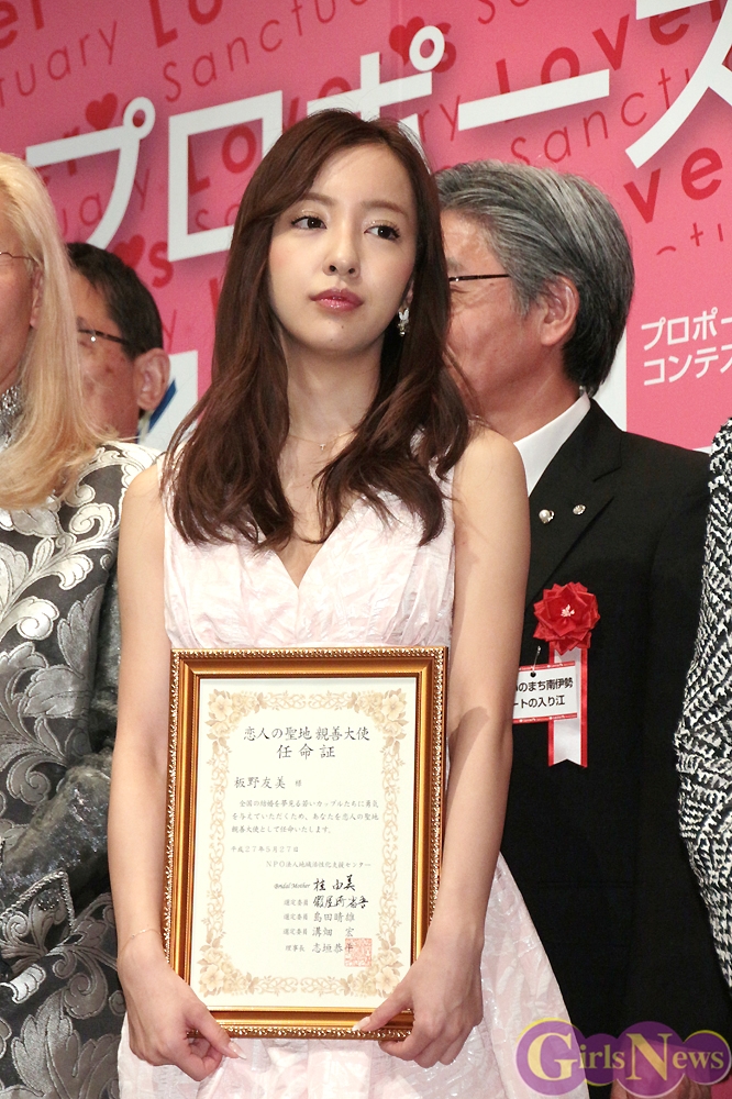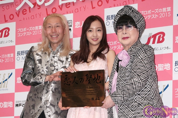 5月27日、「第9回 恋人の聖地 全国プロポーズの言葉コンテスト2015」の授賞式が青山セントグレース大聖堂で行われ、歌手の板野友美さんが「恋人の聖地親善大使」、モデルの大石参月さんが「ウェディング推進大使」の任命証を授与された。
