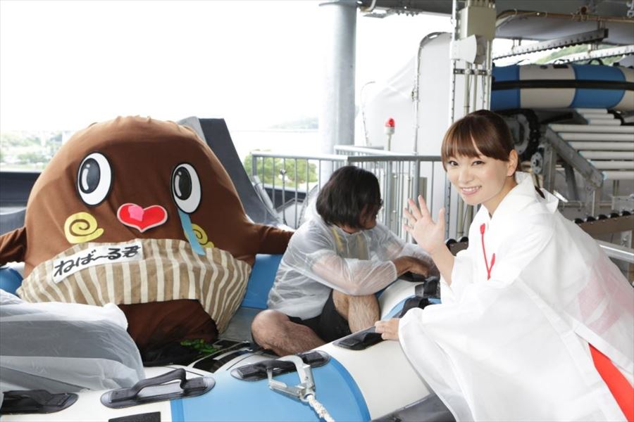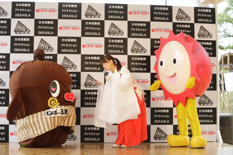 巫女に扮した保田圭さんが”ねば~る君”を東京サマーランドの名物巨大スライダー「DEKASLA(デカスラ)」に『奉納(=スライダー体験)』することで、この夏のヒット祈願と、プール開き宣言を行った。