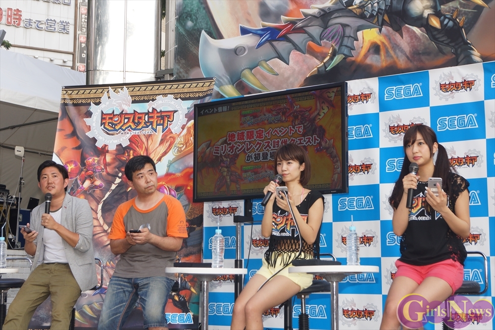 8月3日、セガゲームス『モンスターギア』ハンティング会 本部イベントが新宿ステーションスクエアで行われ、モンギアガールズの菜乃花さんと大貫彩香さんが登場した。