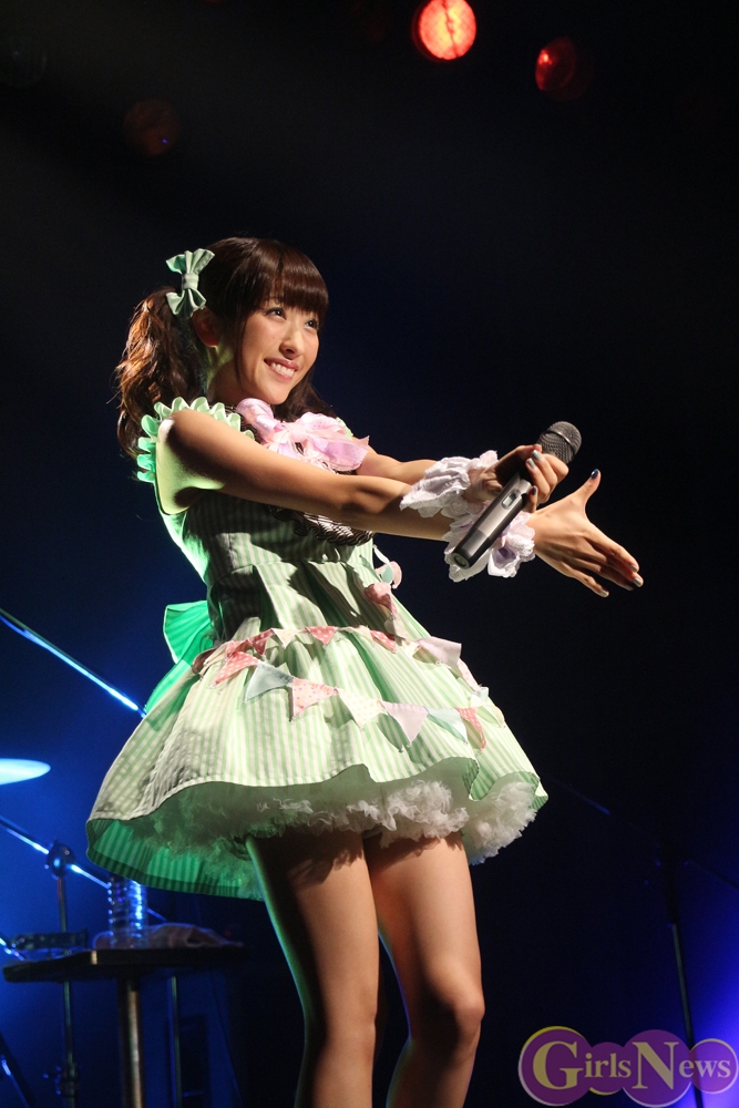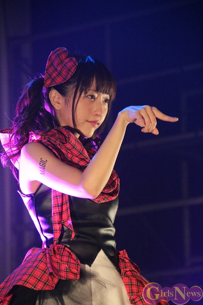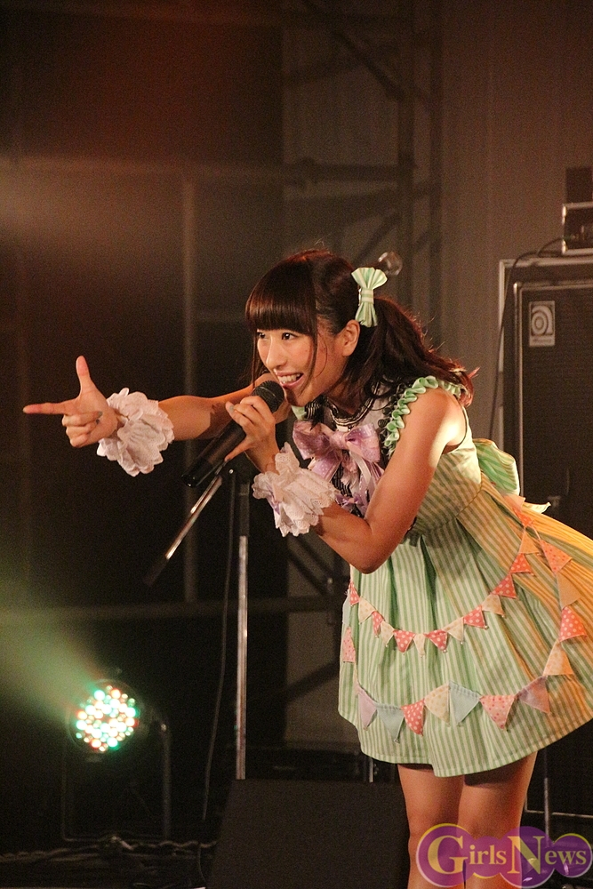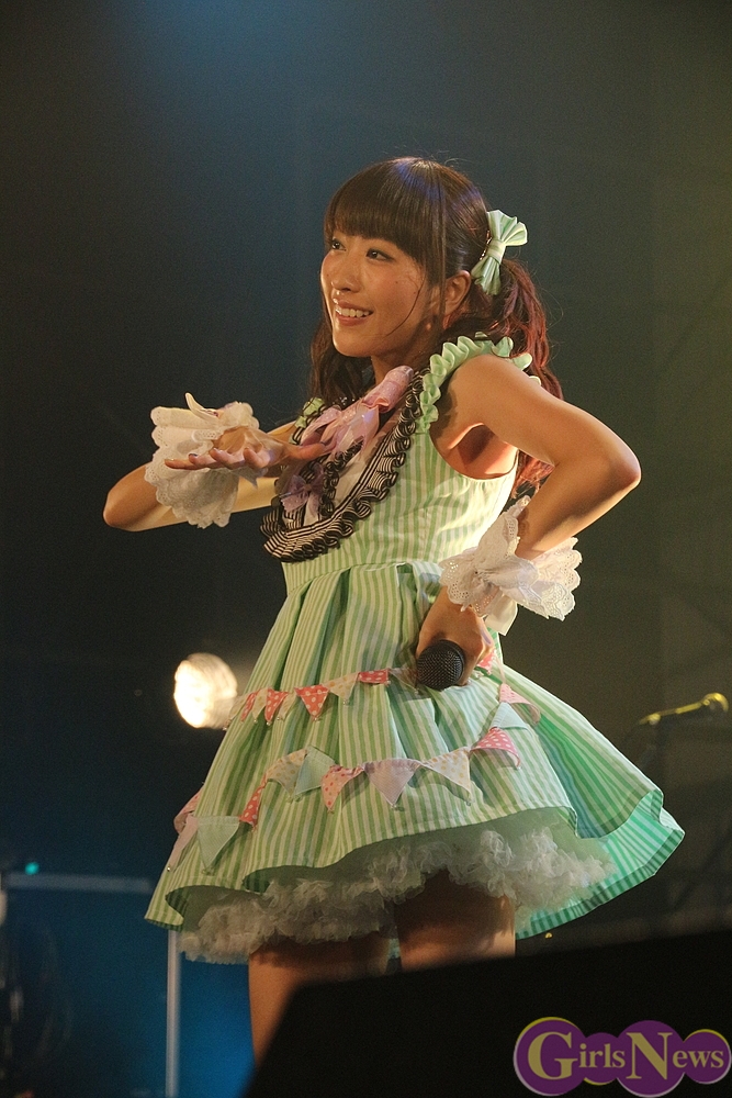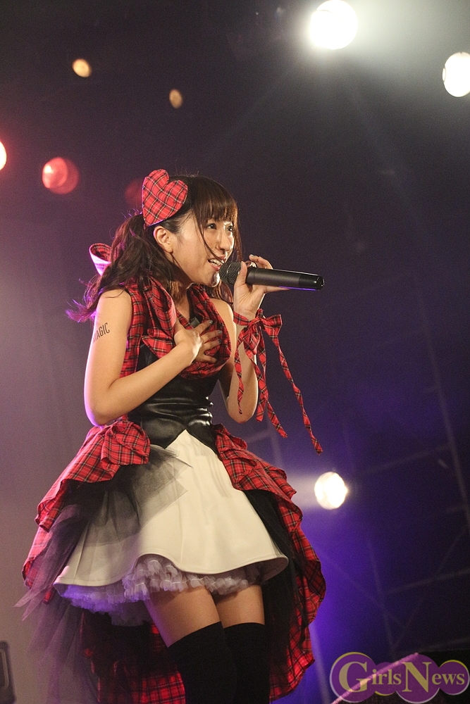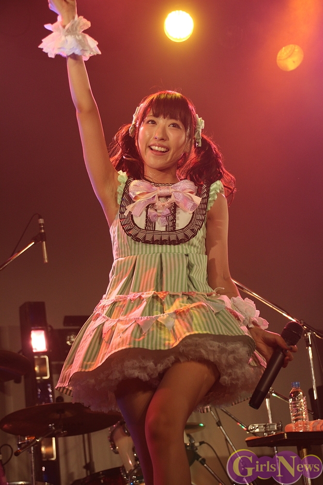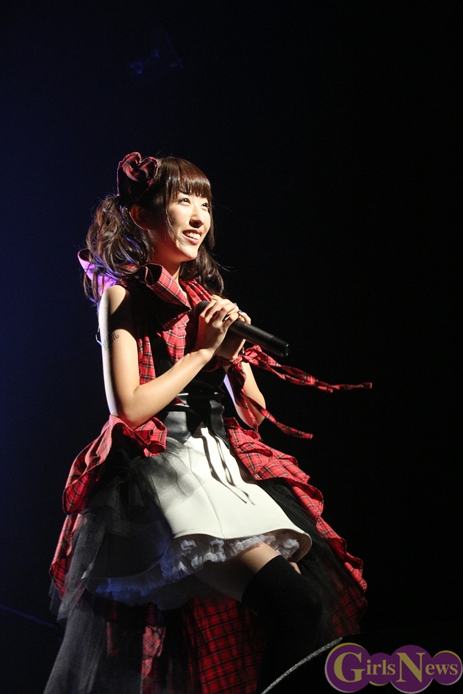 再びMCに戻ると「今回の衣装は実は元アイドルのお友達に作ってもらいました。私のサイズが市販のサイズより“ちょっと”小さいんですよ。なので、いつものマネキンに合わせて作ることが出来なくて、すっごい苦労して、1週間くらい徹夜して作ってくれたんです。」と紹介した。