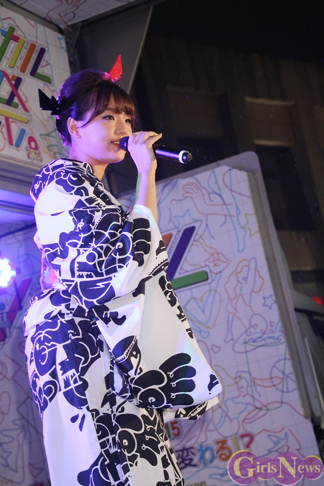 肩を少し出したセクシーな浴衣で登場した篠崎愛さんはさらに、引き続き行われたレセプションパーティーとしてミニライブを行い、小雨が降り続く中で集ったファンや、歌声に足を止めた通行人の耳を奪って、透き通った歌声を響かせた。