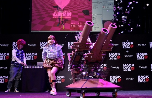 イベント内で行われた、著名プログラマー×芸能人による『COLLABO HACK』は、IT を使った芸能人の新しい表現方法を披露するスペシャルステージ。この企画に、バルーン型のショートパンツ姿で登場した篠崎さん。実はその衣装の中にいくつもセンサーが仕掛けられていて、自身が繰り出す「投げキッス」「ウィンク」「手で作るハートマーク」の 3 つの動きを感知すると、連動したバズーカ―からキラキラの紙吹雪とともにチョコレートが飛び出すという仕組みとなっていた。
