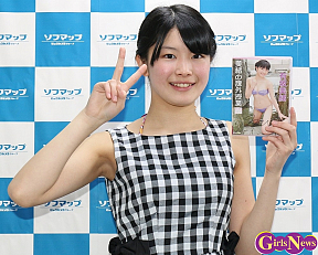 DVDの内容について「制服から展開する白い水着は自分の好みで好き。赤いチューブトップの水着は家具の上に乗って撮りました。制服のシーンでは階段を上ったりしました。スクール水着を着たり、バランスボールで遊んでいるシーンもあります」と紹介。