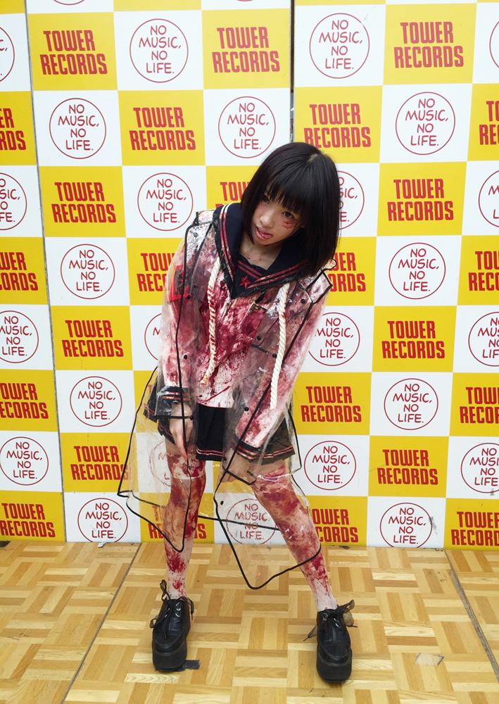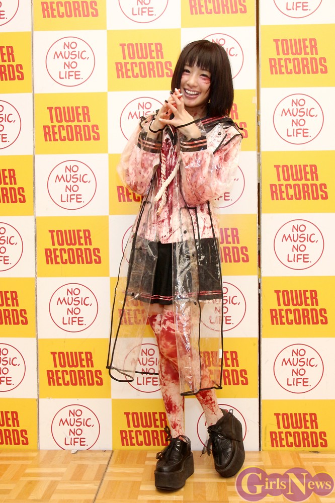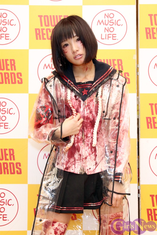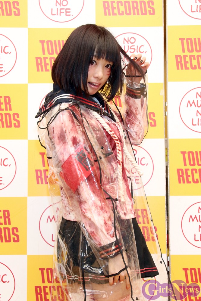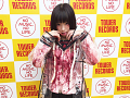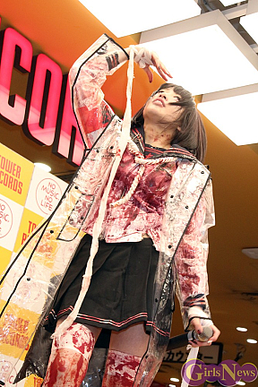 新曲のタイトルにちなんで”心中”をイメージした血まみれの衣装で登場したぴかりんは、さっそく新曲を披露すると、店内にデスボイスを響かせて集まったファンたちを酔わせていた。