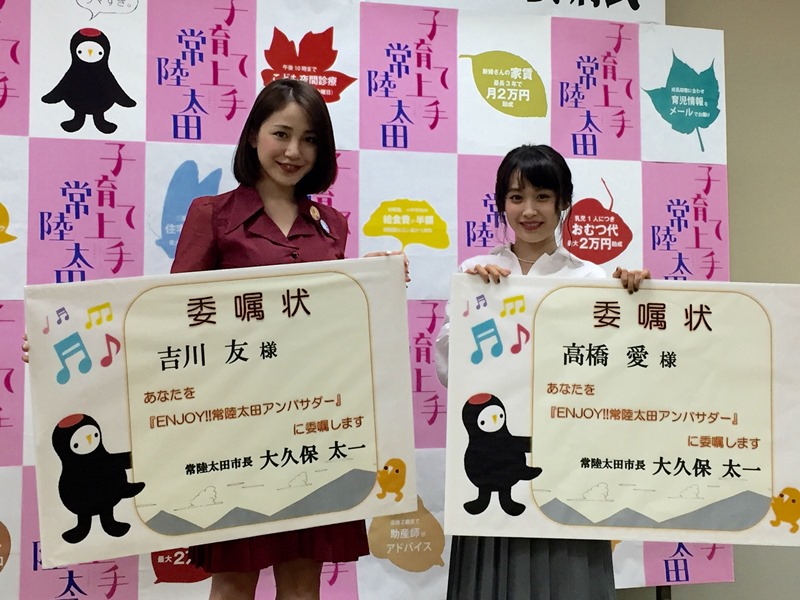 高橋愛さん、吉川友さんが「ENJOY!!常陸太田アンバサダー」に就任、15日、茨城県・常陸太田市役所にて委嘱式が行われ、二人は常陸太田市の大久保太一市長より委嘱状を受け取った。茨城県出身の吉川さんは「芸能界に入って、地元茨城県の魅力を伝える一員になりたいと思っていたので、わがままボディの私がわがままに伝えていきたいと思います」と意気込んだ。