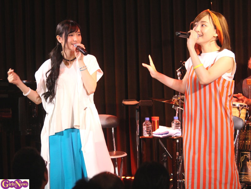 自分たちで選んだという新衣装で登場した二人。レゲエバージョンにアレンジされた1stアルバム曲『オレンジライン』からライブはスタートした。1stシングル『Bitter & Sweet』、2ndシングル『誰にもナイショ』はボサノヴァ・アレンジに。オリジナルはアイドル色の強い『誰にもナイショ』は、大人っぽいサウンドと抑え気味のボーカルで違った趣を見せていた。